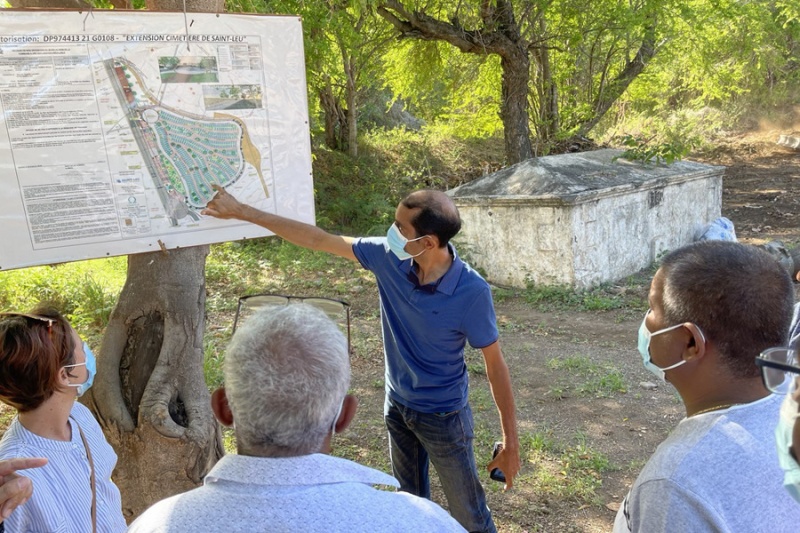 Situé en bordure littorale Sud, le cimetière de Saint-Leu est arrivé à saturation. Des travaux d'extension vont donc être lancés. Le maire saint-Leusien, Bruno Domen, d'autres élus, les services de la collectivité et l'entreprise retenue, ont effectué cette semaine une visite sur les lieux. Les élus ont approuvé un agrandissement sur un foncier situé à côté du cimetière actuel. (Photo ville de Saint-Leu)