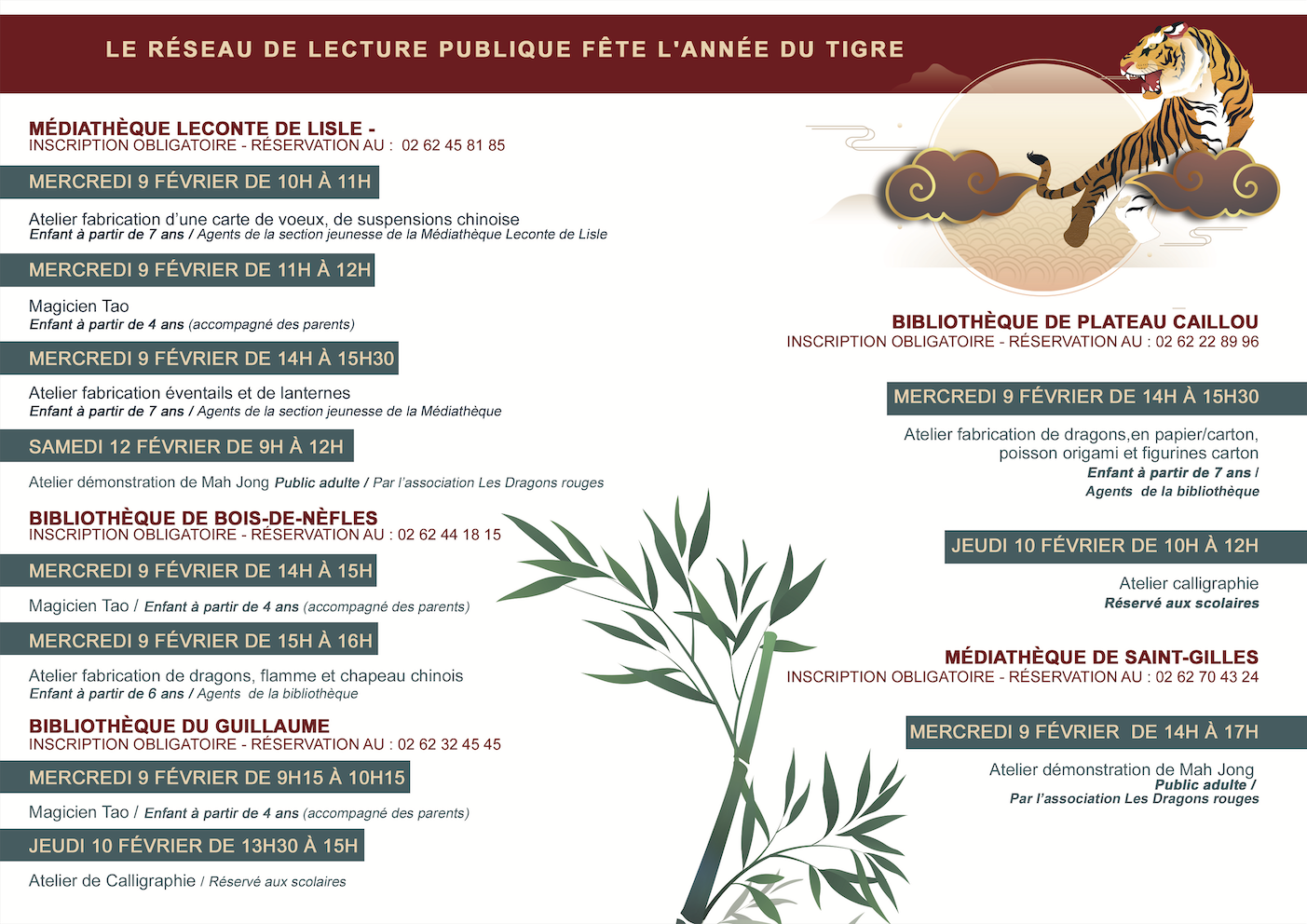 La bibliothèque du Guillaume, la médiathèque Leconte de LISLE, la bibliothèque de Bois-de-Nèfles, la bibliothèque de Plateau Caillou ou encore la médiathèque de Saint-Gilles se parent des couleurs et du Nouvel An Chinois. Une décoration réalisée par les agents des bibliothèques et médiathèques.