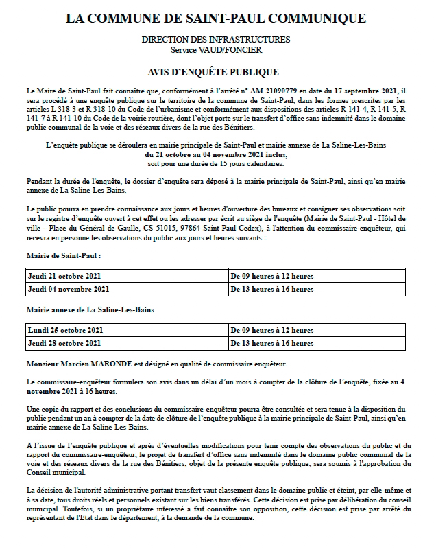 La Ville de Saint-Paul porte à la connaissance des habitants des différents secteurs du territoire communal du début des enquêtes publiques portant sur le transfert d'office sans indemnité dans le domaine public communal des voies et réseaux divers (Photo d'illustration rb/www.ipreunion.com)