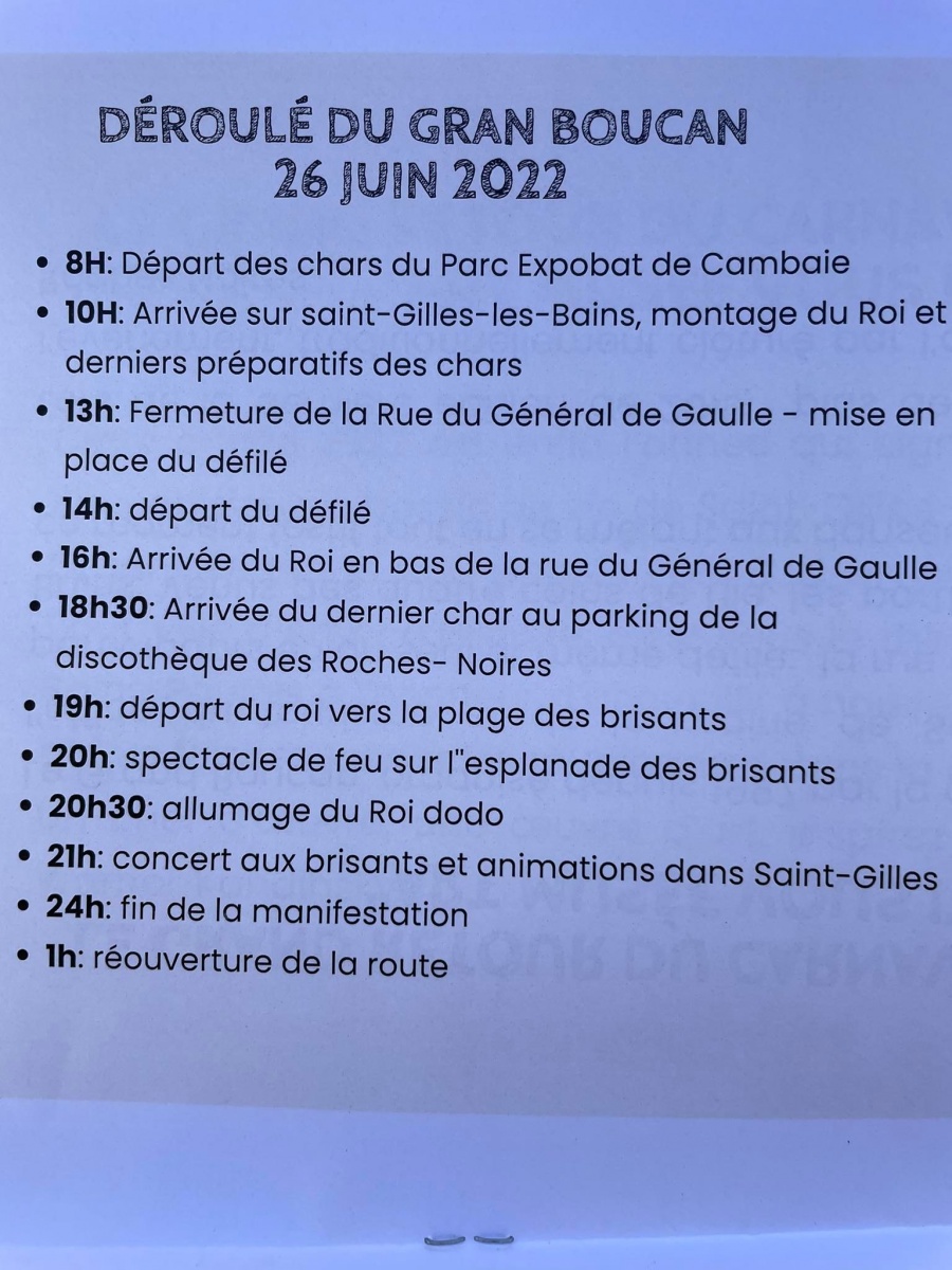 C'est un événement de taille pour la commune saint-pauloise. Le défilé du Grand boucan, qui n'avait pas eu lieu depuis 2019, va envahir à nouveau les rues de Saint-Gilles-les-bains. Dans un esprit de carnaval, chars et participants costumés y prennent part en suivant le roi Dodo, une sculpture immense qui change chaque année. En fin de soirée, celle-ci "passe au bûcher" sous les acclamations des spectateurs.
