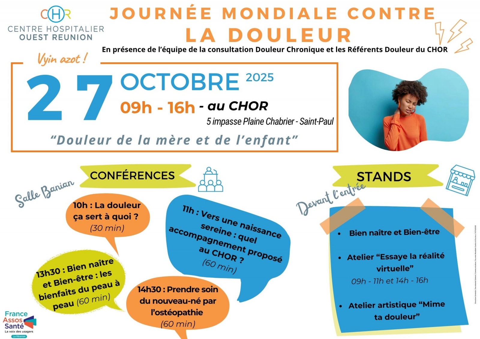 Le lundi 27 octobre 2025 de 9h à 16h, le Centre Hospitalier Ouest Réunion (Saint-Paul) organise une journée dédiée à la prise en charge de la douleur. Au centre des activités, "la douleur de la mère et l'enfant", une thématique qui va rythmer la journée ". Au programme, des conférences et des stands bien-être.