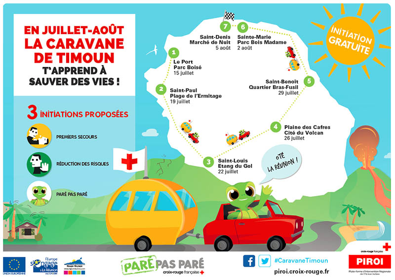 La Plateforme d'Intervention Régionale de l'Océan Indien, en partenariat avec la délégation territoriale de la Croix-Rouge française de La Réunion, organise du 15 juillet au 5 août 2017, la 3ème édition de la Caravane de Timoun. Ce dispositif itinérant souhaite proposer aux Réunionnais, pendant les vacances scolaires, des initiations gratuites aux risques de catastrophes naturelles et aux gestes de premiers secours. Nous publions ci-dessous le communiqué de la mairie de Saint-Paul