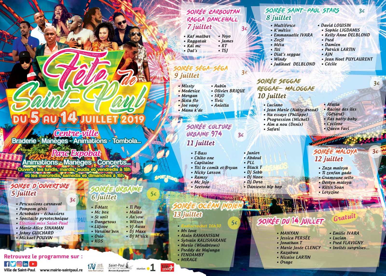 Zot paré pou fé la fèt ? Saint-Paul i ariv en blok ! Les Fêtes de Saint-Paul débarquent en force du 5 au 14 juillet 2019 ! Les festivités se dérouleront à la braderie commerciale du centre-ville et au parc Expobat pour une série de concerts.