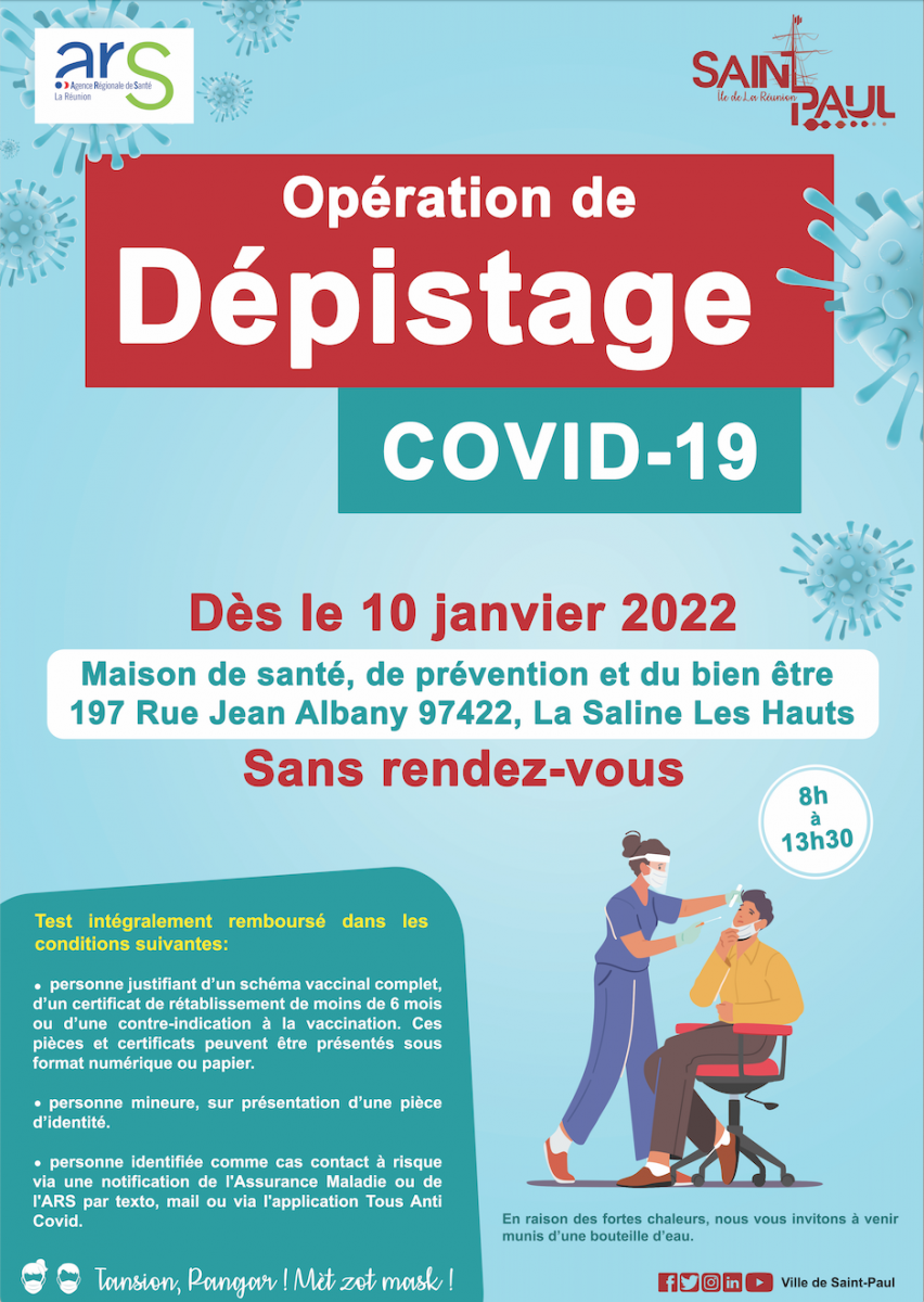 Face à la propagation rapide du coronavirus sur La Réunion ces dernières semaines, un nouveau centre de dépistage s'ouvre dès le lundi 10 janvier à la maison de santé, de prévention et du bien être situé à La Saline Les Hauts, à Saint-Paul. Le centre est ouvert de 8h00 à 13h30. Les tests sont gratuits pour les vaccinés, les mineurs, et les personnes identifiées comme cas contact à risque. Plus d'informations ci-dessous. (Photo d'illustration : rb/www.ipreunion.com)