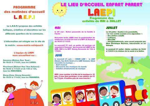 Le lieu d'accueil enfant-parent de la commune de Saint-Paul présente son programme d'activités jusqu'au mois de juillet 2017. Plusieurs activités sont au programme. L'équipe de LAEPI accueille le public de 9h30 à 11h30 tous les lundis à la Maison pour Tous de Savanna, mais aussi tous les mercredis jusqu'à 16h00 à Fleuriront et jusqu'à 11h30 les vendredis à la Case Jimmy Desamb à l'Etang.