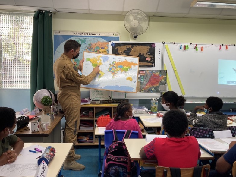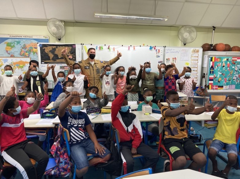 Ce jeudi 7 octobre, les élèves de l'école élémentaire Jean-Luc Daly-Eraya à la Grande Fontaine ont eu la visite exceptionnelle dans leur classe du pilote de chasse réunionnais Sébastien Nativel. Accompagné du maire de Saint-Paul, Emmanuel Séraphin, le Capitaine Sébastien " Babouc " Nativel a répondu aux questions en rafale posées par les marmailles. Nous publions le communiqué ci-dessous (Photo ville de Saint-Paul)