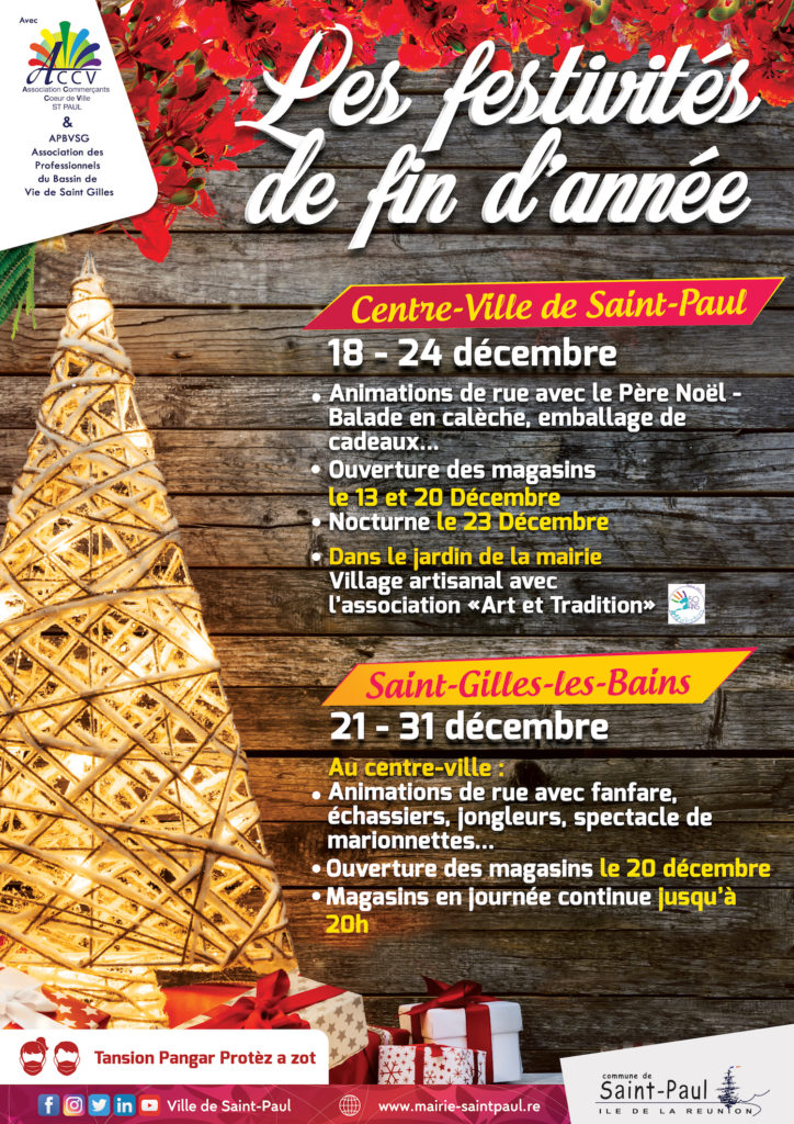 Un beau programme pour les festivités de fin d'année ! On vous invite à venir vivre la féérie de Noël ! Profitez de ces derniers jours pour réaliser de bonnes affaires et dénicher les cadeaux de vos rêves tout en respectant les gestes barrières et la distanciation sociale. Tansion pangar protèz à zot !