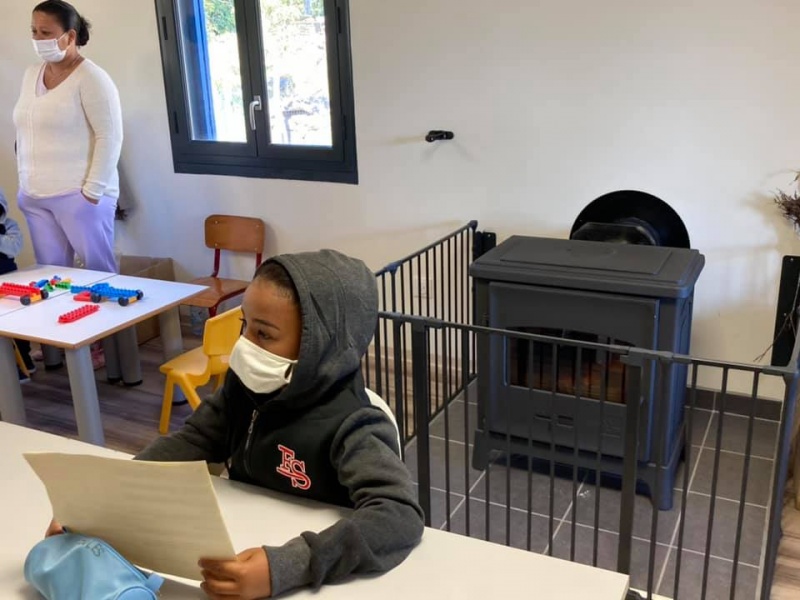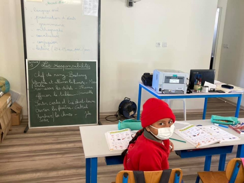 Neuf enfants de niveaux différents (du CP au CM2) apprennent à lire, écrire, compter, cliquer et à respecter dans une classe de 40 mètres carrés. Toutes et tous suivent des cours dans un environnement serein jusqu’à la livraison de la totalité de l’école à la fin 2022.