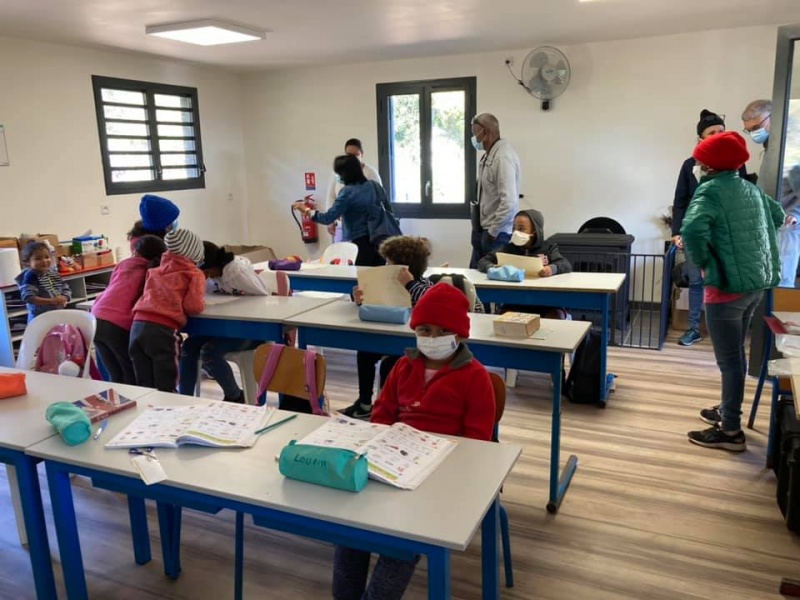 "Direction les trois écoles du Cirque : Marla, Roche Plate et les Orangers. Ces petit.es Saint-Paulois.es suivent un rythme aménagé car elles, ils terminent leur semaine de cours le vendredi midi (ils ont donc cous le mercredi matin - ndlr). L’occasion de découvrir la nouvelle école sécurisée de Roche Plate. La première partie de cette structure vient d’ouvrir ce 16 août. Moins d’un an après la fermeture de l’ancien établissement, menacé par la falaise, fragilisée par l’incendie du Maïdo.