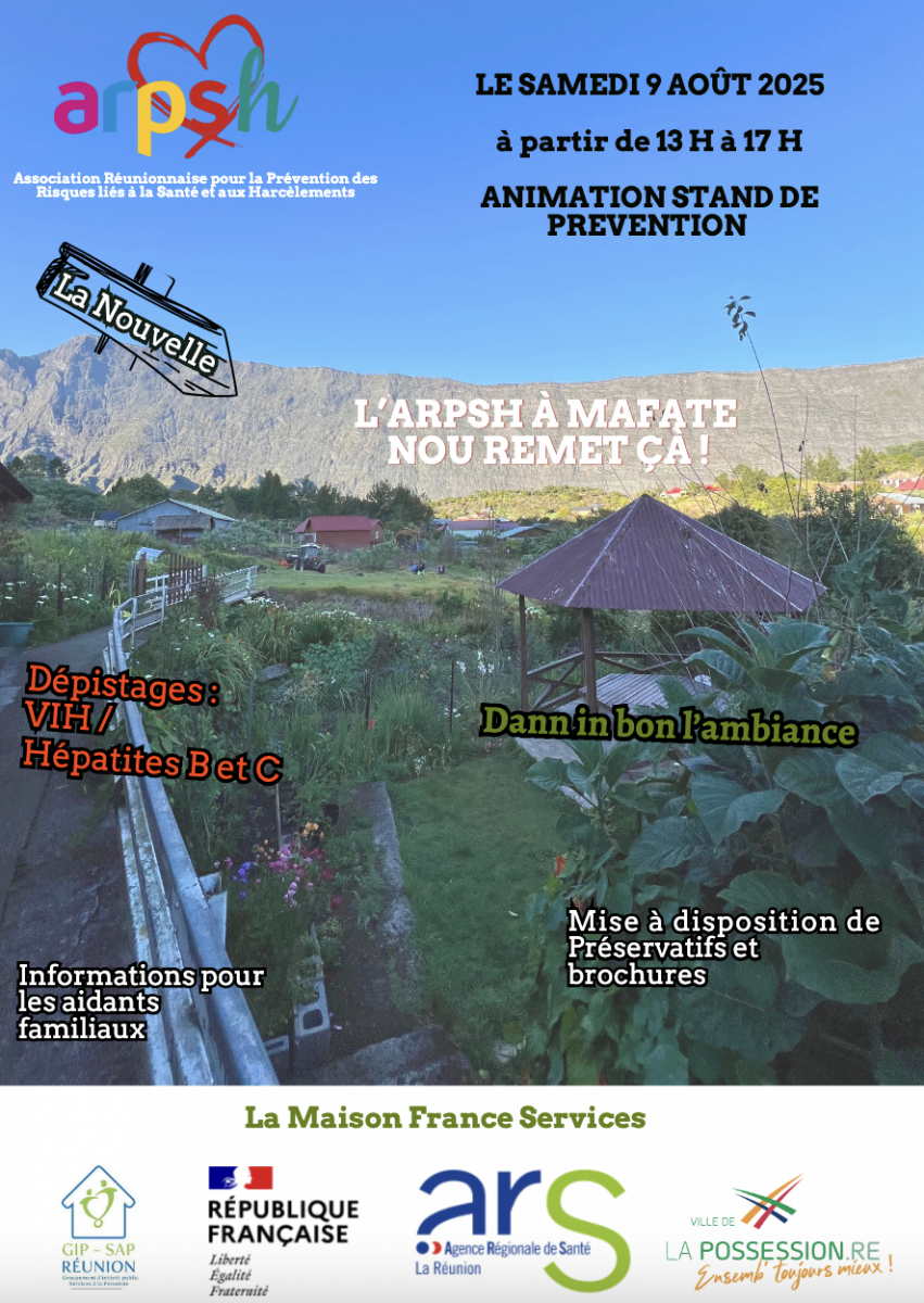 Pour rendre cet 3ème événement encore plus mémorable, nous sommes de nouveau ravis de présenter une animation tenue d’un stand de prévention avec l’équipe de l’ARPSH. Venez profiter de leurs performances en direct tout en participant à une journée dédiée à la prévention et à la sensibilisation. L'ARPSH encourage tous les habitants de Mafate, de La Nouvelle, ainsi que les randonneurs à se joindre à cette journée cruciale pour leur santé sexuelle.