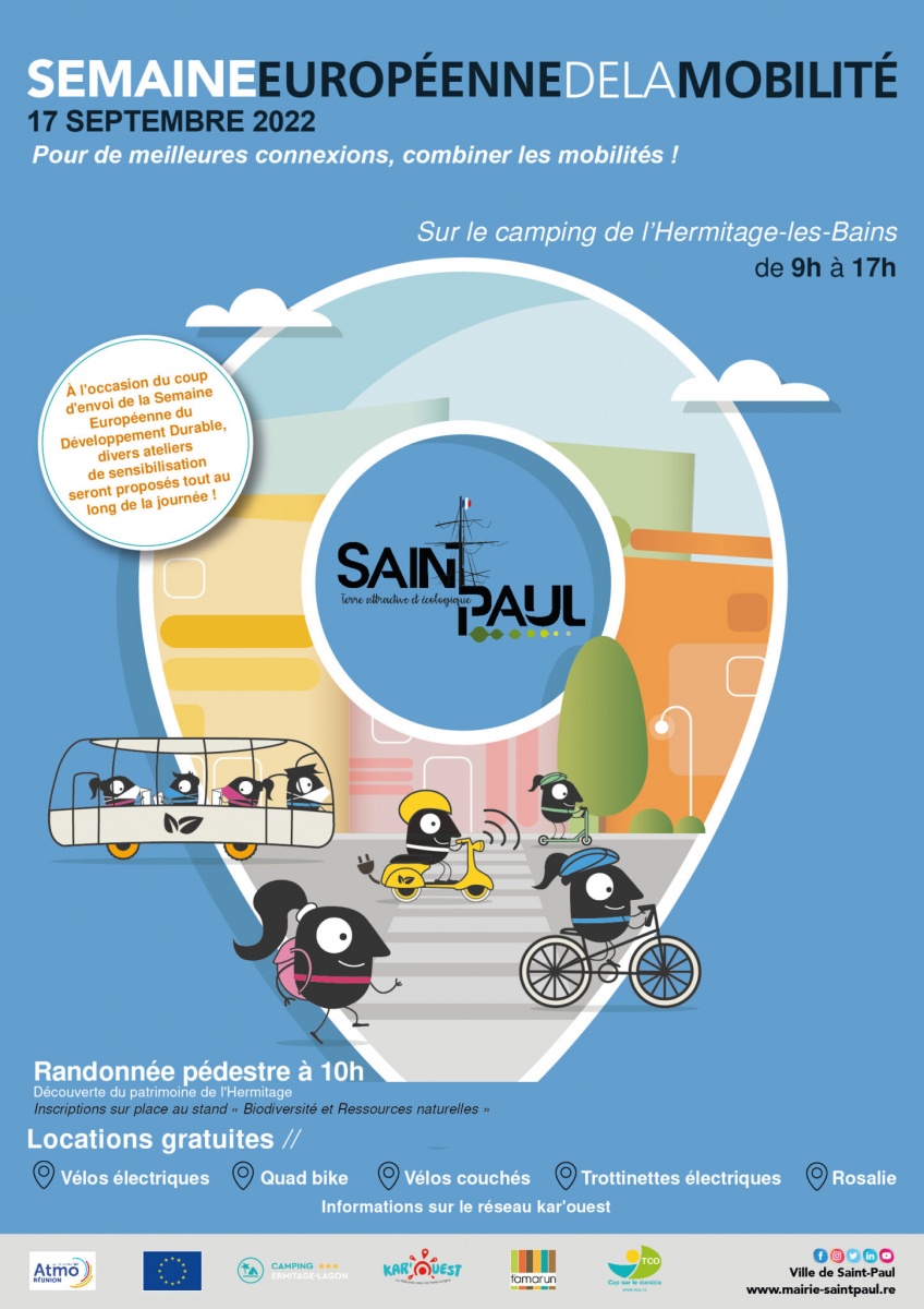 Samedi 17 septembre 2022, des activités ludiques et découvertes seront proposées au public gratuitement de 9h à 17h au camping de l'Hermitage, dans le cadre de la 22ème édition de la semaine européenne de la mobilité. Petits et grands pourront s'essayer aux différents modes de déplacement doux et alternatifs : quad-bike, vélo à assistance électrique, vélo couché, Rosalie Run', grimpe aux arbres, trottinette électrique... Autant d'activités qui vont, à coup sûr, ravir les visiteurs et les faire réfléchir dans leur mode de déplacement au quotidien. Nous publions ci-dessous le communiqué de la ville de Saint-Paul. (Photo : ville de Saint-Paul)
