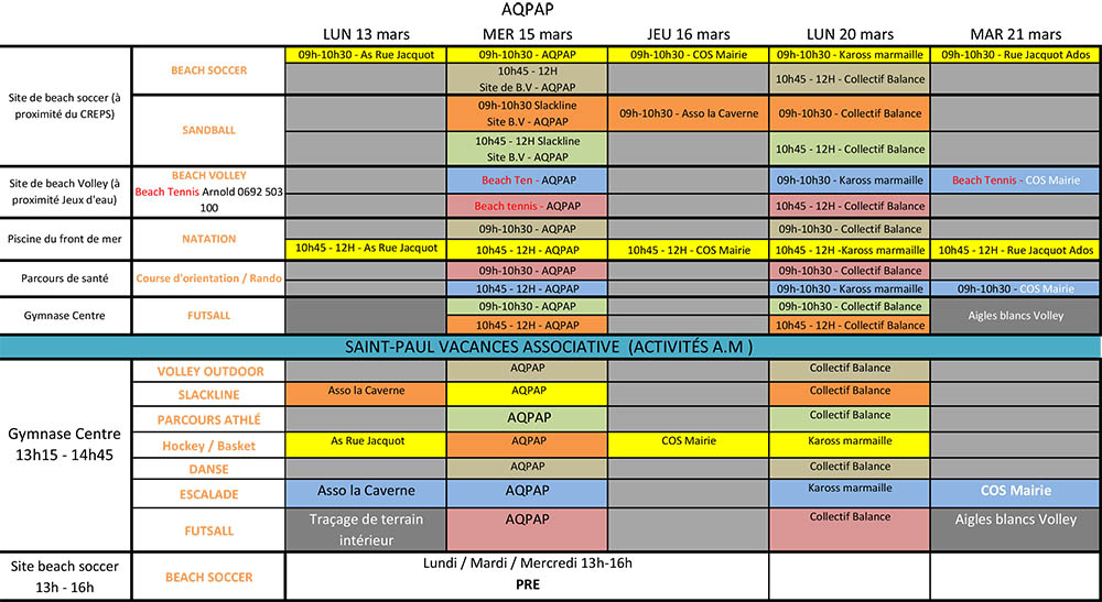 Des ateliers sportifs à destination des enfants de 8 ans à 12 ans sont implantés sur le front de mer de Saint-Paul jusqu'au mardi 21 mars 2017. L'animation est organisée par la mairie de Saint-Paul en partenariat avec les associations et les centres d'accueil de loisirs sans hébergement (ALSH). Environ 250 enfants sont attendus