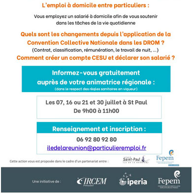 Pour rappel, cette action se déroule dans le cadre d’un partenariat entre la Fédération des particuliers employeurs de France et la ville de Saint-Paul. Vous pouvez vous renseigner et vous inscrire à ces sessions gratuites au 06 92 80 92 80 et par e-mail.