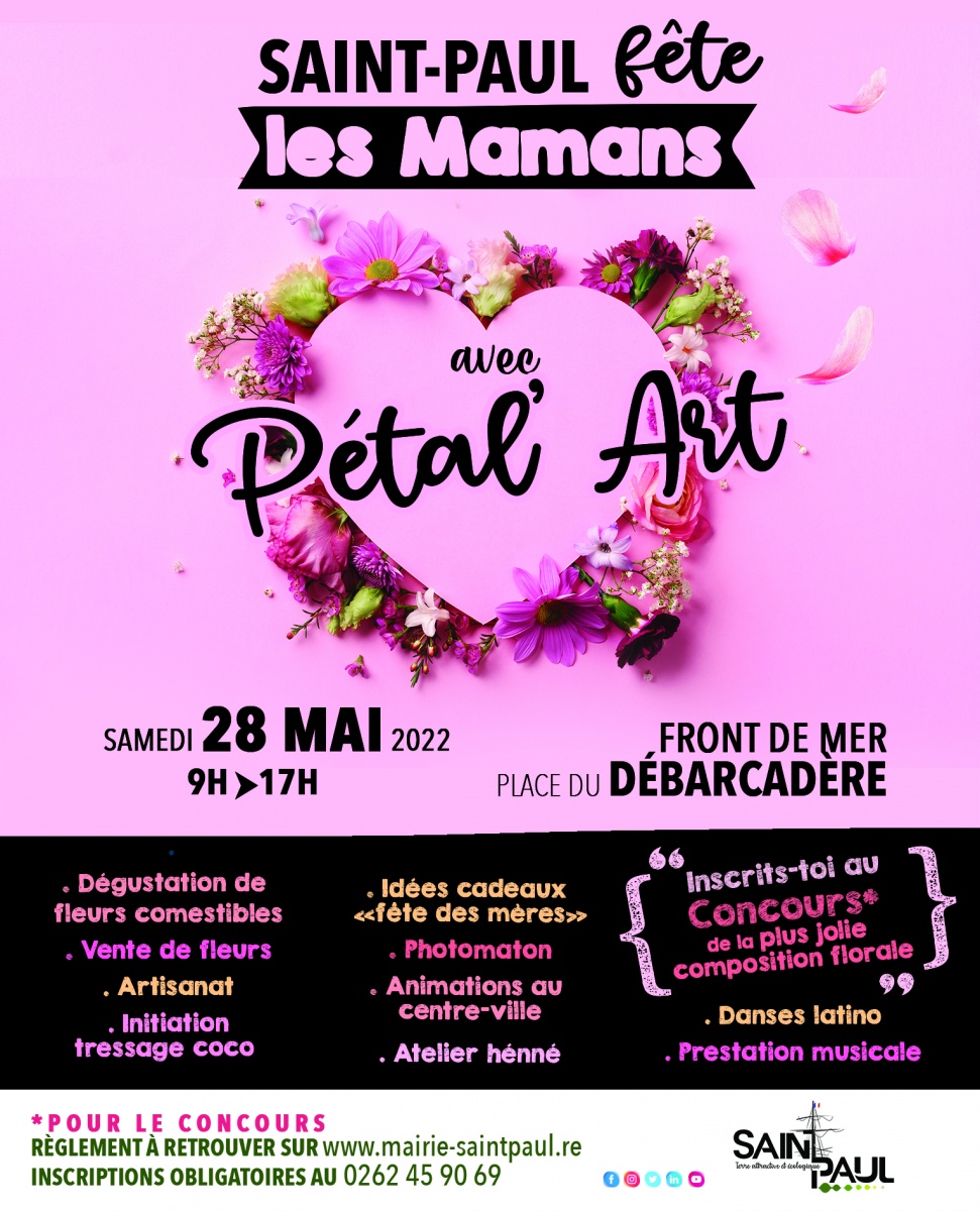 Venez dénicher le cadeau intemporel pour la fête des mères avec la vente de fleurs ! D’autres idées cadeaux vous y attendent ! Pour l’occasion des animations seront proposées au centre-ville de Saint-Paul. Et pour célébrer cette journée dédiée aux Mamans, participez au concours de la plus jolie composition florale .