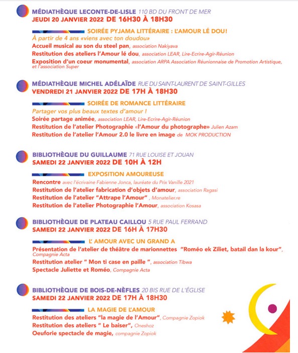 Lorsque les vacances culturelles s’invitent aux Nuits de la lecture, cela promet de grands moments d’évasion dans le réseau de lecture publique de Saint-Paul : Médiathèque Leconte-de-Lisle, Médiathèque Michel ADÉLAÏDE, bibliothèque du GUILLAUME, bibliothèque de Plateau Caillou, bibliothèque de Bois-de-Nèfles. Au programme : des restitutions d’ateliers qui se sont déroulés dans le cadre des Vacances Culturelles, théâtre de marionnettes, spectacles, expositions, soirée partage animée… Autant d’activités qui combleront de joie petits et grands.