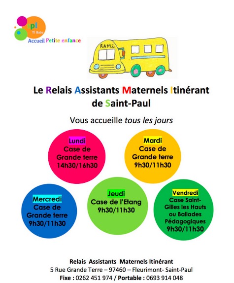 L’équipe du RAMI, une éducatrice de jeunes enfants et une animatrice petite enfance, vous accueille dans les nouveaux locaux du RAM à Fleurimont mais aussi sur les lieux d’itinérance ; au CASE de Saint-Gilles-les-Hauts, au CASE de l’Etang, ou encore en extérieur pour des ballades pédagogiques (à Savannah, à la grotte des premiers français, à Boucan…)