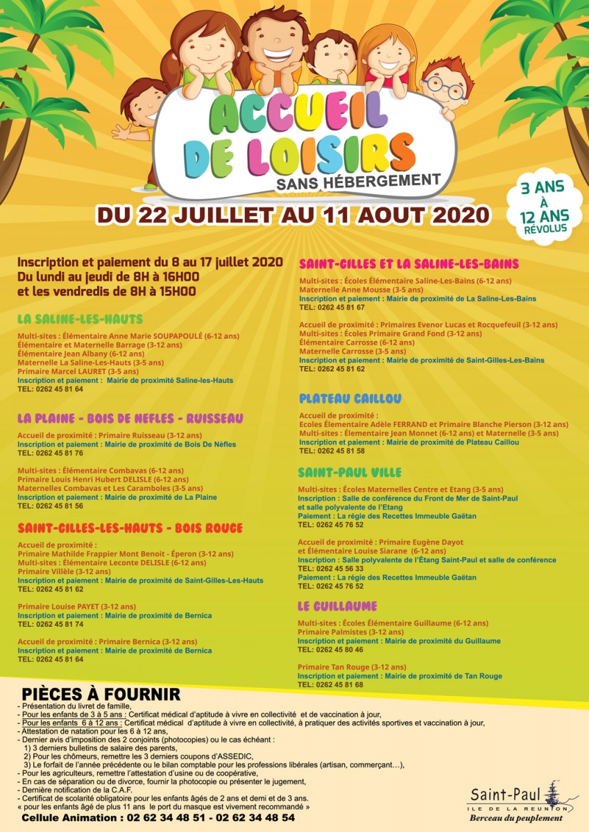 Les inscriptions pour les ALSH (accueils de loisirs sans hébergement) de Saint-Paul sont ouvertes jusqu'au vendredi 17 juillet 2020. "Les marmailles âgés entre 3 et 12 ans seront accueillis au sein de 35 centres de loisirs à partir du mercredi 22 juillet au mardi 11 août" indique la marie saint-pauloise dans un communiqué que nous publions ci-dessous