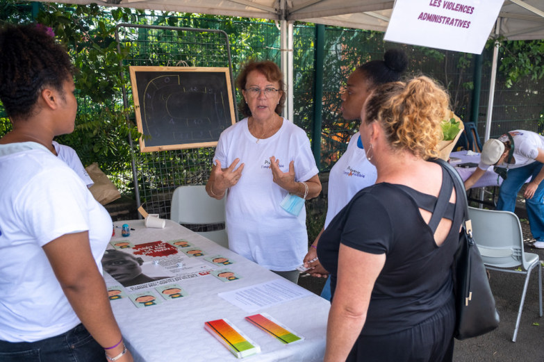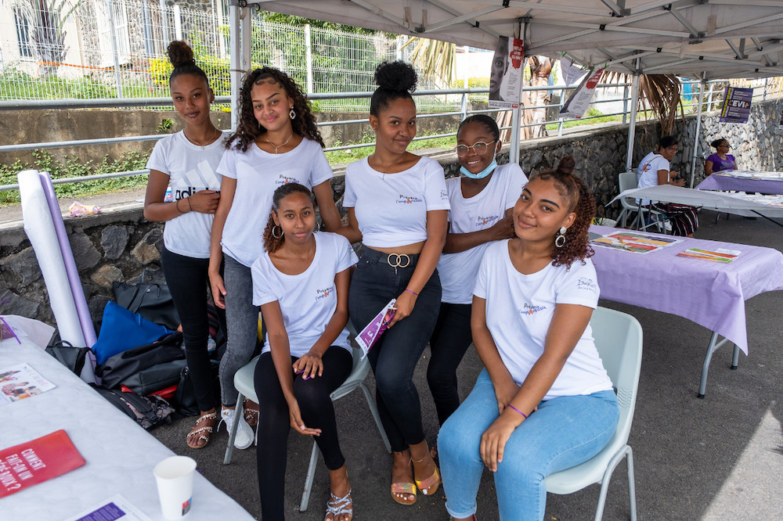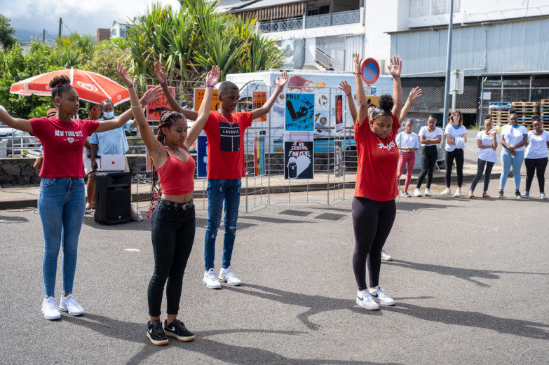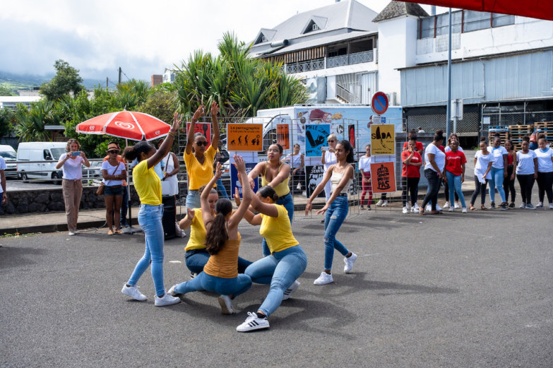 Dans le cadre de la Journée Internationale des Droits des Femmes, une action préventive s'est déroulée ce mercredi 9 mars 2022 sur la place du marché forain de la Saline-Les-Hauts. De 8h à 12h, s'est tenu un forum de prévention aux violences conjugales et intrafamiliales porté par la Compagnie Saint-Pauloise Escaladanse. (Photo : ville de Saint-Paul)