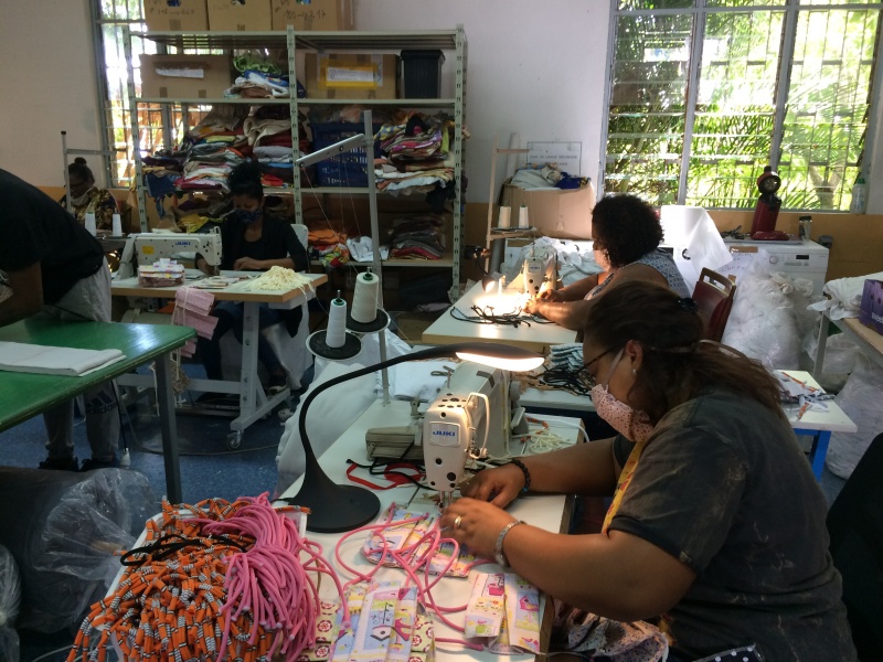 9h ce mardi matin, les machines à coudre, les fers à repasser... tournent à plein régime dans ce local de Saint-Gilles-les-Hauts. Deux salles de l’ancienne école du quartier, mises à disposition de l’association Ti tang récup’ par la ville et aujourd’hui transformées en une petite usine de manufacture de 22 salariés et 6 encadrants.