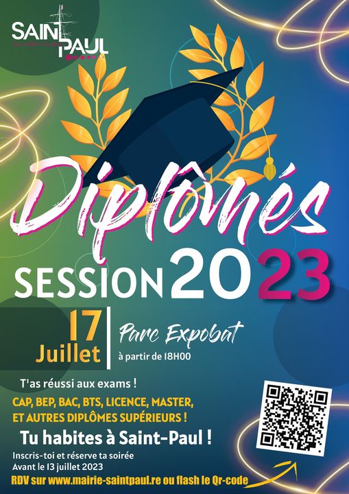 Afin de célébrer leur réussite aux examens (baccalauréat général, professionnel ou technologique, licence, master, BTS, CAP ou BEP, ainsi que tout autre diplôme supérieur), la Ville de Saint-Paul invite les diplômés de la session 2023, résidant à Saint-Paul, à une soirée mémorable au Parc Expobat.