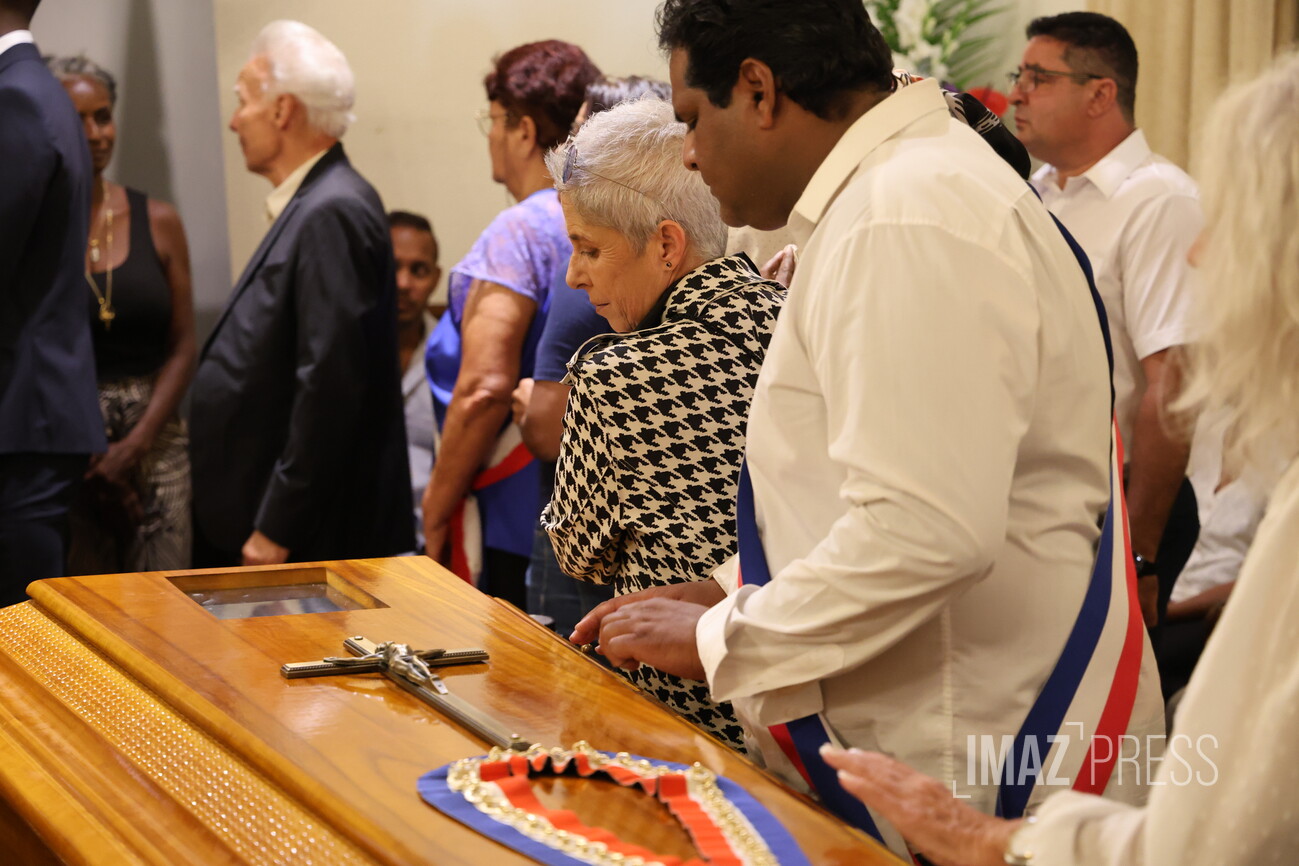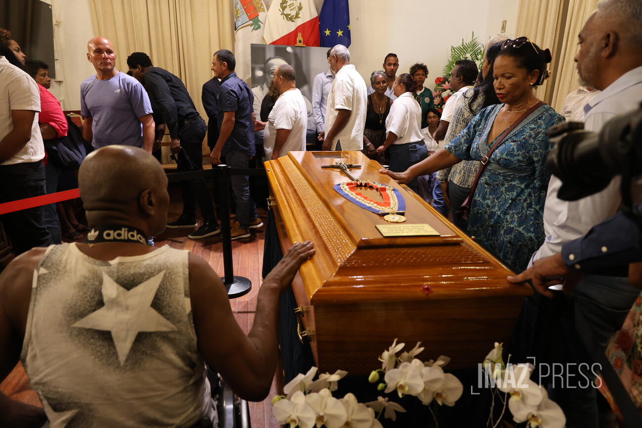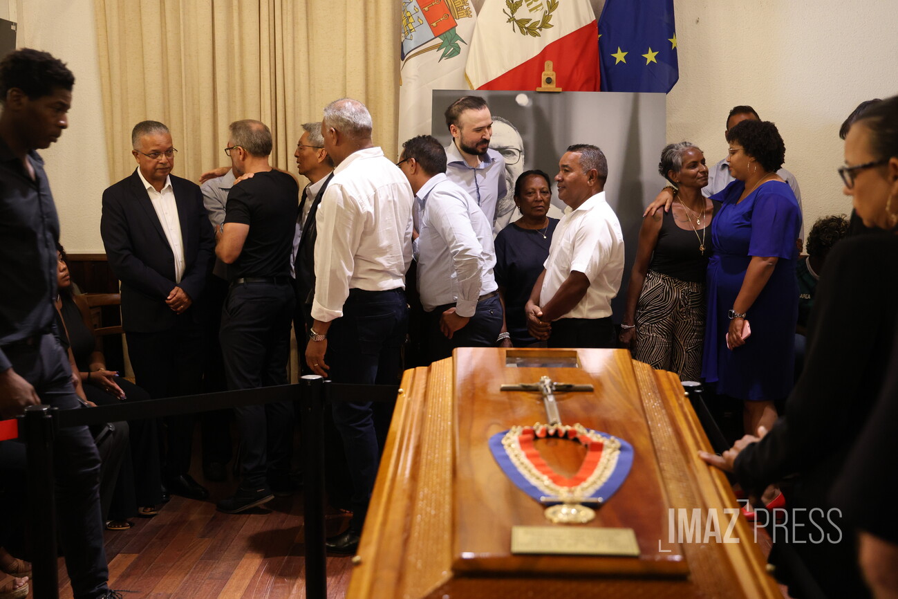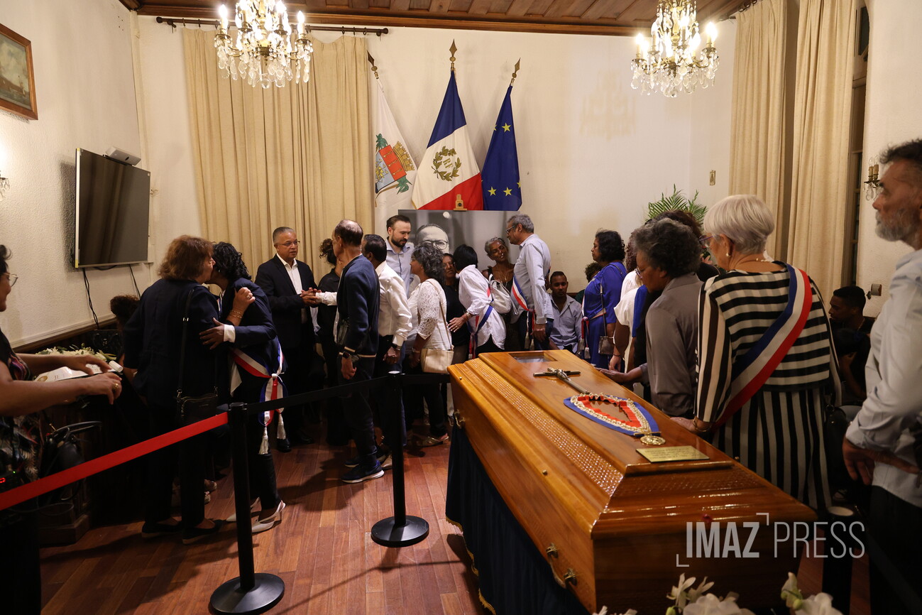 Depuis ce dimanche soir 30 mars 2025 Michel Fontaine, repose dans une chapelle ardente érigée dans son bureau de maire de Saint-Pierre. Des milliers de personnes, des personnalités et une foule d'anonymes, sont déjà venus rendre hommage à cette personnalité majeure de la scène politique de La Réunion. L'hommage public se poursuit jusqu'à ce mardi matin. Une cérémonie religieuse aura lieu mardi après-midi à l'église de Terre-Sainte à Saint-Pierre (Photos : rb/www.imazpress.com)