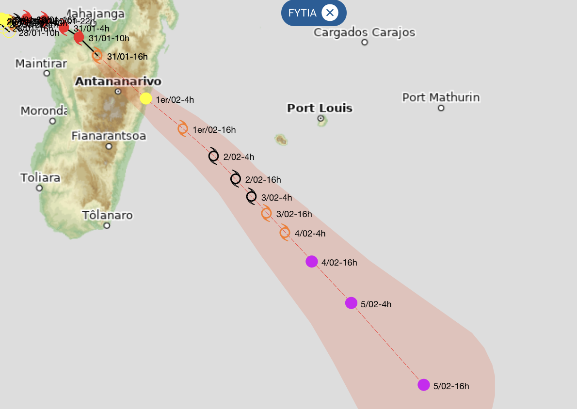 (Actualisé) Fytia a touché terre sur le nord-ouest de Madagascar (province de Mahajanga) en fin de nuit ce samedi 31 janvier 2026. Il "est le plus puissant phénomène à frapper cette province depuis Andry en 1983", indique Météo France. Cet après-midi, le système a été rétrogradé au stade de tempête tropicale modérée. "Sa trajectoire devrait continuer durablement vers le sud-est, avec une réintensification au stade de forte tempête tropicale envisagée à partir de dimanche soir", préviennent les météorologues. Il circulera au large du sud-ouest des Mascareignes et de La Réunion lundi avant de s'éloigner plus au sud les jours suivants (Photos : BNGRC, L'Express Madagascar)