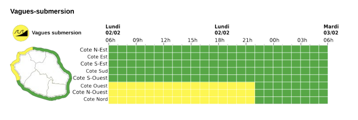 La houle cyclonique devrait déferler sur les côtes ouest de l'île avec des vagues de l'ordre de 3 mètres en hauteur significative. Les côtes ouest et nord sont en vigilance jaune vagues-submersions, l'ouest et le sud en vigilance vents forts.
