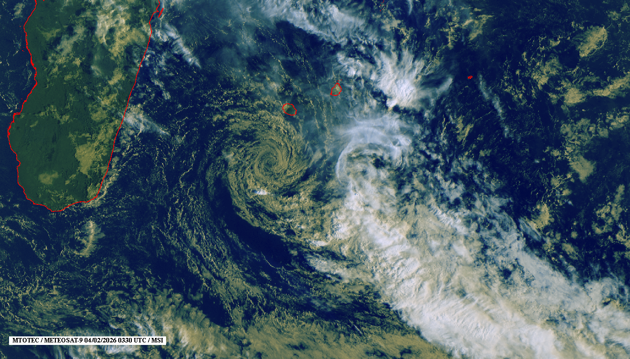 (Actualisé) Les météorologues continuent de suivre, ce mercredi 4 février 2026 la zone perturbée qui se trouvait à 16h "à 700 km au nord-est de Saint-Brandon et montre des signes d'intensification lente". Ce système devrait continuer à s'intensifier lentement dans les prochaines 24 heures. "Le stade de tempête tropicale modérée est attendu à partir de jeudi soir et sera suivi d'une intensification plus rapide à partir de vendredi" estime Météo France. "En début de semaine prochaine, le système devrait transiter au nord des Grandes Mascareignes à une distance qui reste encore à préciser" notent les météorologues. A noter que Fytia s'est définitivement éloigné (Photo www.mtotec.com)