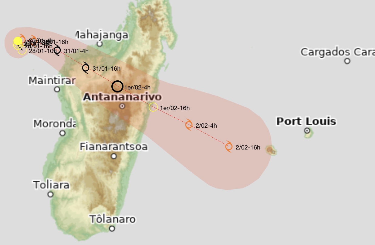 Centre positionné le 31/01 à 16h locales, par 16.9 Sud / 45.6 Est.