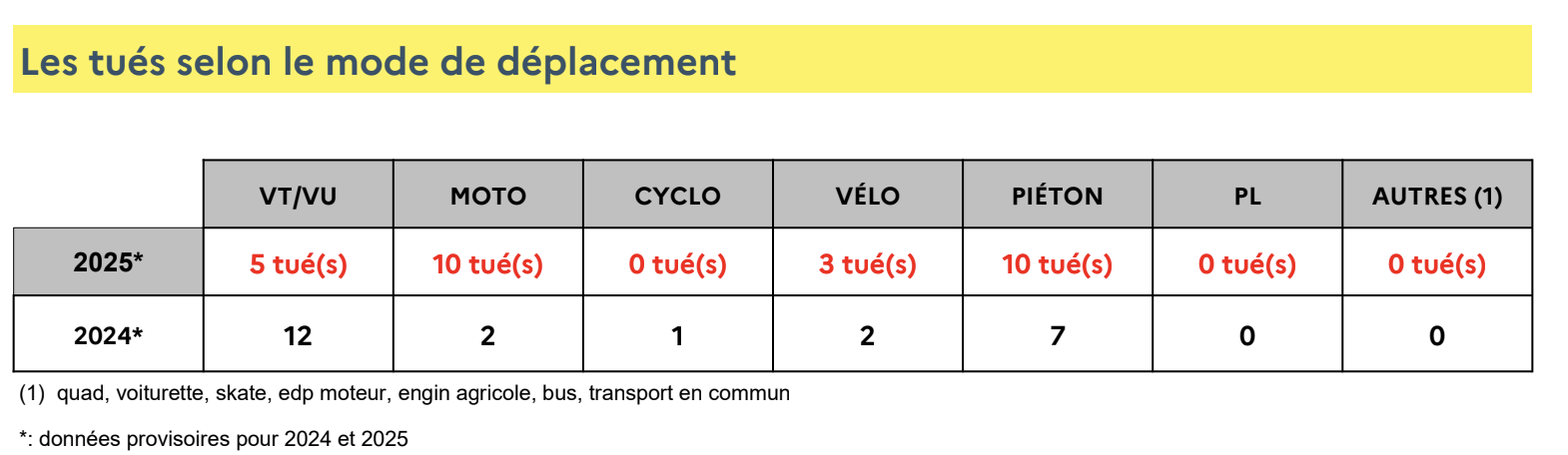 Les premières victimes de ces accidents mortels sont les motards et les piétons. 10 pilotes et 10 piétons tués en 2025, 5 automobilistes et 3 cyclistes.