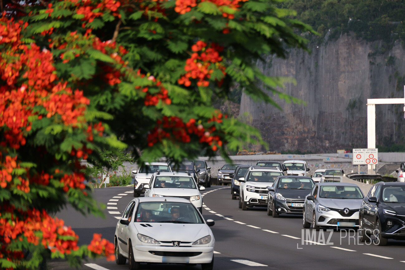 Ça sature sur le réseau routier de La Réunion. On observe plus de 200.000 automobilistes en heure de pointe et une hausse du trafic routier de 3 à 6% entre septembre et novembre 2025. Matins et soirs, les conducteurs se retrouvent coincés dans leur voiture, avec ou sans pluie, avec ou sans accident. Les axes particulièrement concernés : l'entrée ouest et est de Saint-Denis, La Possession, Saint-Paul et Saint-Pierre. (Photo rb/www.imazpress.com)