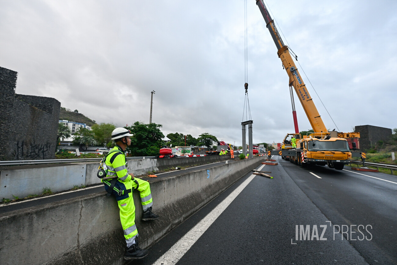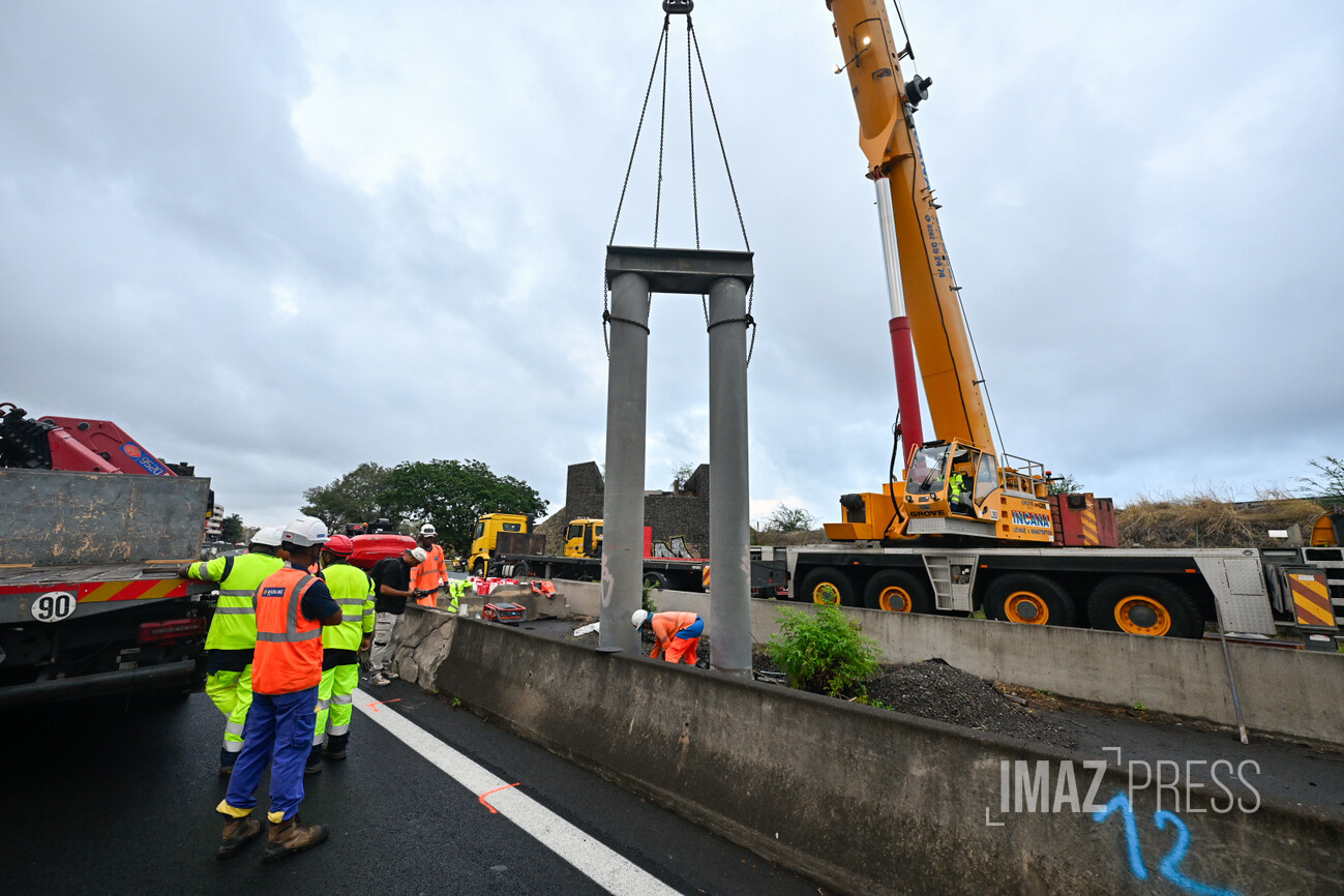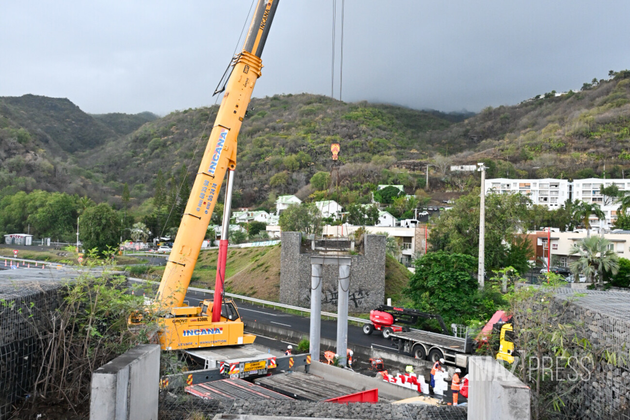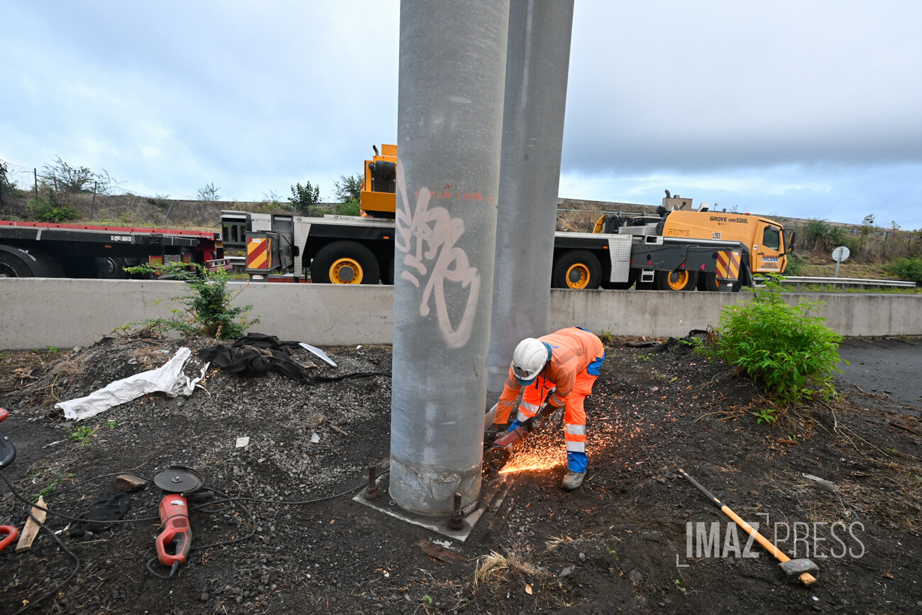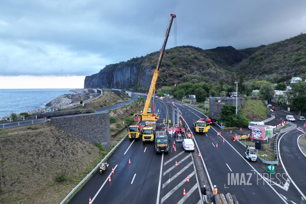 Une grue spéciale de 300 tonnes et une vingtaine de personnes ont été mobilisées sur le chantier. "L'ouvrage est normalement temporaire, donc prévu pour être démonté, remonté", indiquait précédemment à Imaz Press, le directeur général adjoint, chargé des routes et déplacements à la Région Réunion.