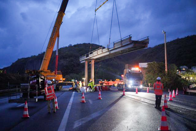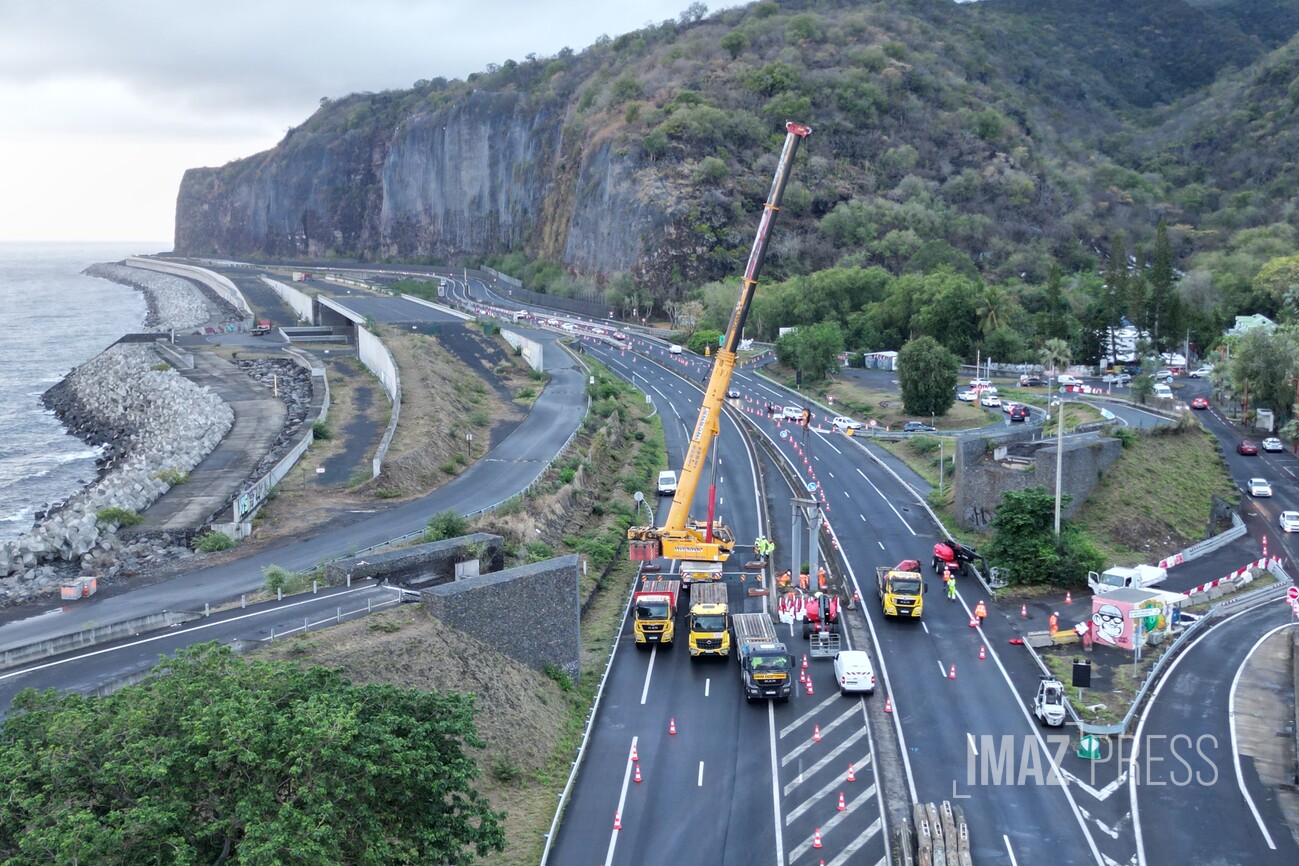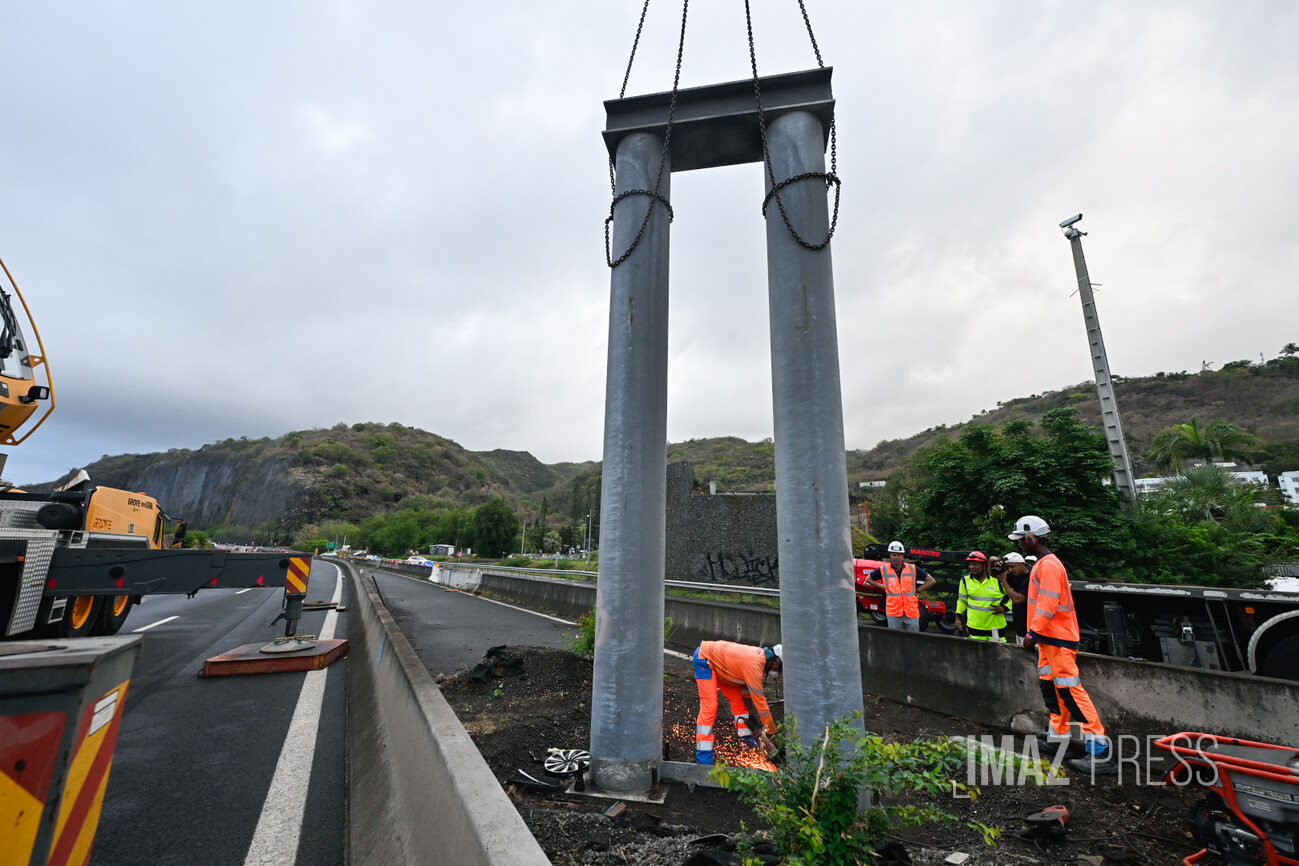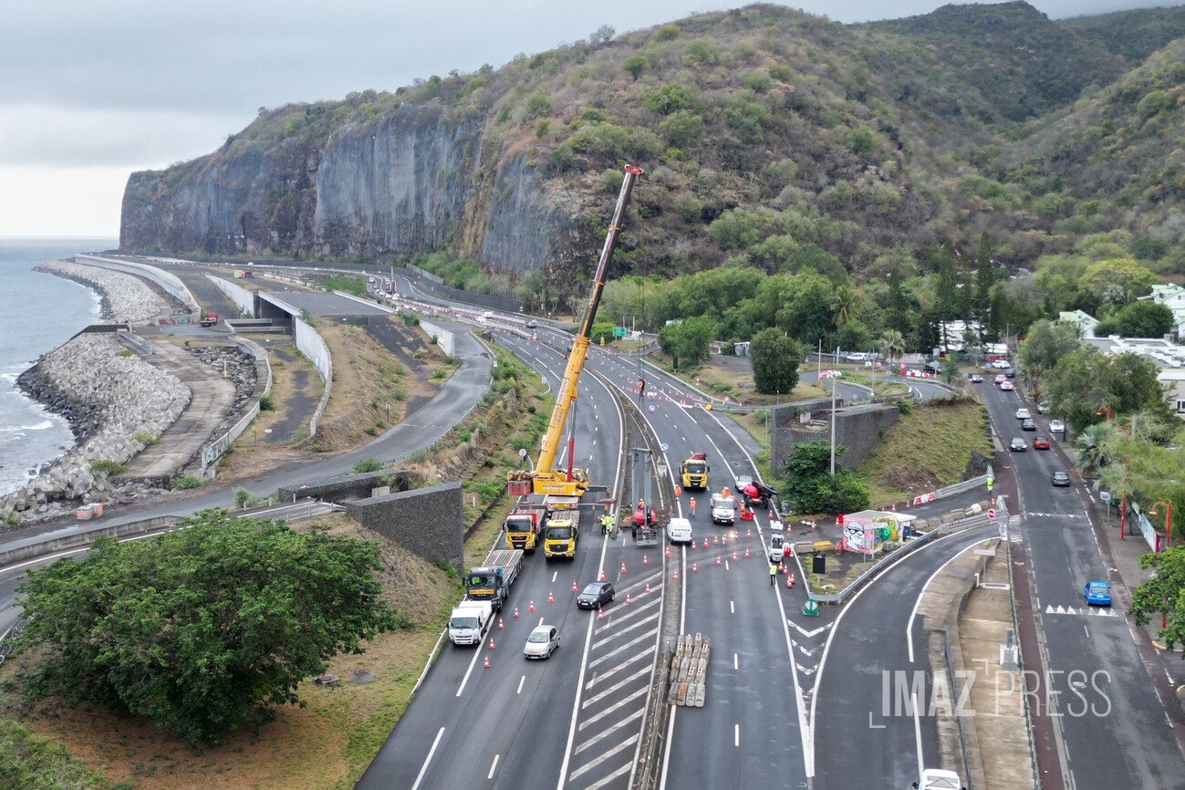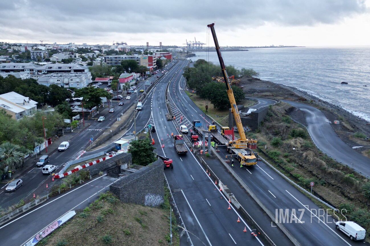 Une grue spéciale de 300 tonnes et une vingtaine de personnes ont été mobilisées sur le chantier. "L'ouvrage est normalement temporaire, donc prévu pour être démonté, remonté", indiquait précédemment à Imaz Press, le directeur général adjoint, chargé des routes et déplacements à la Région Réunion.