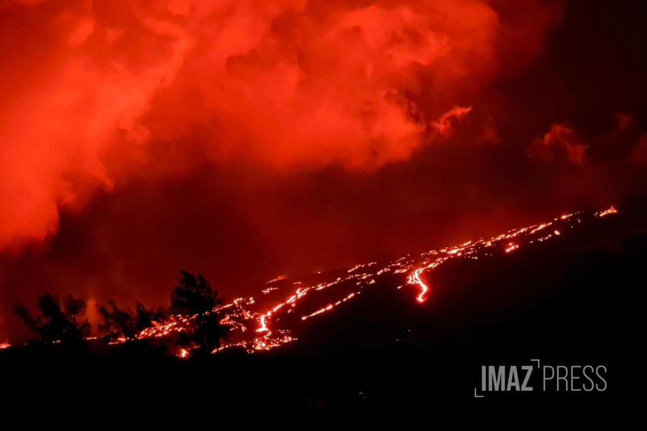 (Actualisé) Après trois jours d'arrêt, le Piton de la Fournaise a jugé que le spectacle n'était pas terminé. Ce samedi 28 mars 2026, l'éruption a repris du côté du Piton de Bert. Le magma est arrivé en surface au niveau du dernier cône éruptif de l’éruption débutée le 13 février 2026. Cette reprise d’activité fait suite à la reprise du trémor éruptif depuis 15 heures ce samedi. La lave descend les Grandes Pentes mais seul le bras sud est de nouveau réalimenté (Photo : Richard Bouhet/www.imazpress.com)