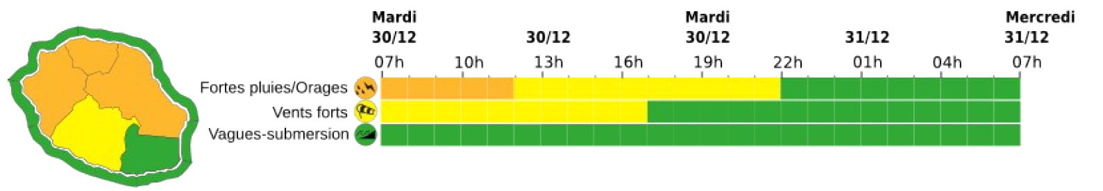 C'est sous la pluie que La Réunion se réveille de nouveau ce mardi 30 décembre 2025. Depuis 4h, le nord, l'est et l'ouest de l'île sont en vigilance oranges fortes pluies et orages au moins jusqu'à 12h. Le sud est en vigilance jaune. L'ouest est aussi en vigilance jaune vents forts depuis 7h. De forts cumuls de pluie sont toujours attendus, alors que la journée de lundi a déjà été particulièrement compliquée pour les usagers de la route.