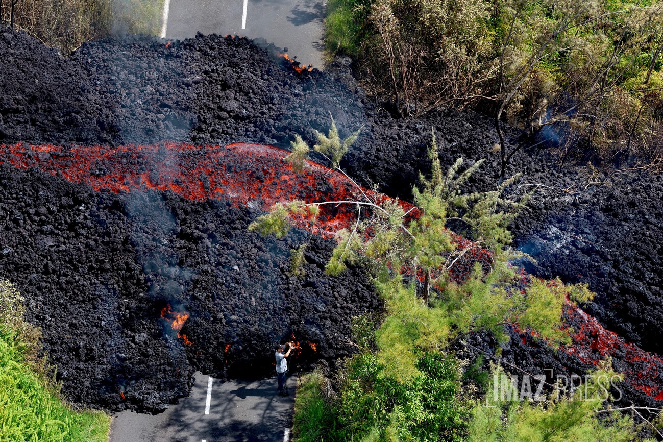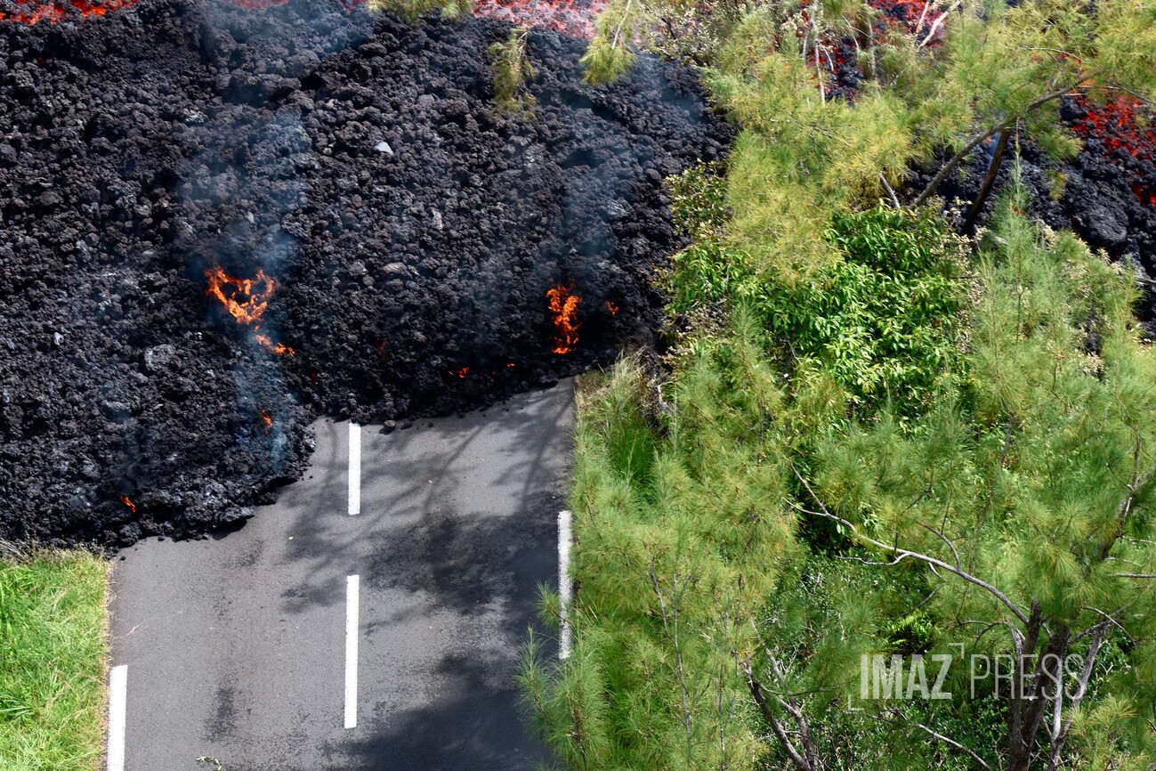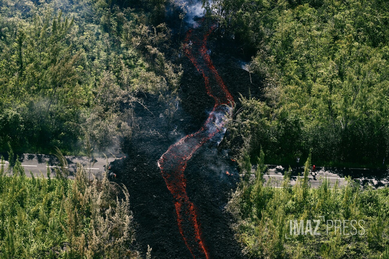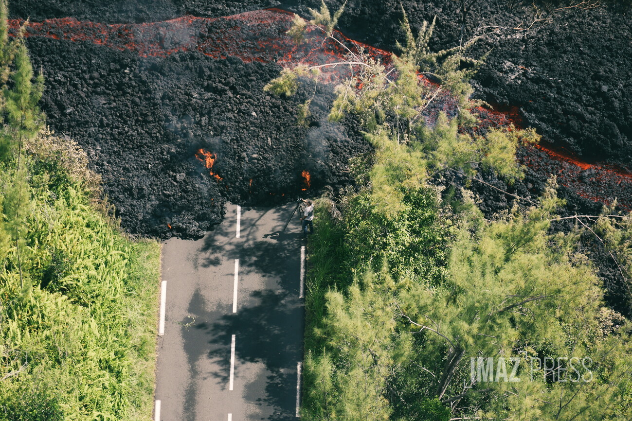 C'est fait, vers 8h10, la coulée de lave est franchement entrée sur la RN2 et a commencé à traverser la voie de circulation. C'est la coulée la plus au nord qui a franchi le bitume après l’avoir frôlé pendant plus de deux heures. La coulée plus au sud ne l'a pas encore touché, sa progression est extrêmement lente.