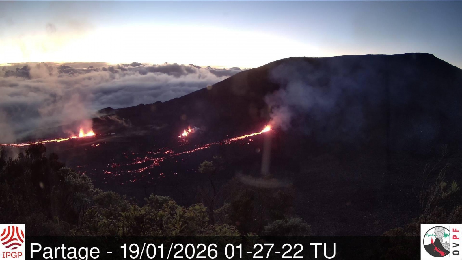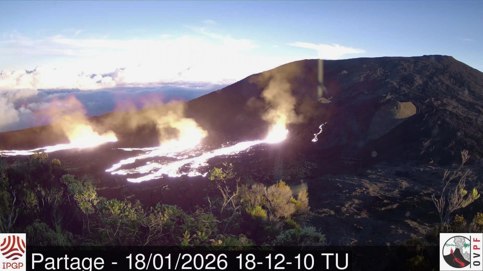 (Actualisé) Le Piton de la Fournaise est entré en éruption ce dimanche 18 janvier 2026 à 19h45. Ce lundi 19 janvier, l’Observatoire volcanologique du piton de la Fournaise (OVPF) précise que "même si l'activité est en baisse, l'éruption se poursuit". Plusieurs fissures éruptives "se sont ouvertes sur le flanc nord du volcan" a indiqué dimanche soir l’Observatoire. L'ouverture de nouvelles ouvertures de fissures sont possibles estiment les volcanologues (Photo : Oliv Idos et capture OVPF).