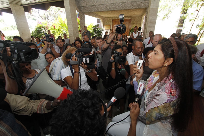 Nassimah Dindar est venue faire une brève intervention, vers 13h05 ce lundi 30 novembre 2009, devant la centaine d'ex-salariés de l'Arast postés depuis le matin devant le Conseil Général. Elle a auparavant reçu une délégation de 11 représentants des travailleurs sociaux de l'Arast soutenue par les dirigeants de l'intersyndicale FO, CFDT, CGTR, Solidaires et UNSA. La Présidente du Département a confirmé que ce mercredi 2 décembre, 800 aides à domicile devraient pouvoir bénéficier de CDD de six mois et elle a annoncé qu'elle soumettrait l'ouverture de 1000 postes au vote des élus lors de l'Assemblée Plénière du Conseil Général le 16 décembre prochain. Le sort des salariés autres que les aides à domicile demeure incertain. Les TISF (Techniciens de l'intervention sociale et familiale) n'ont pas été reçus.