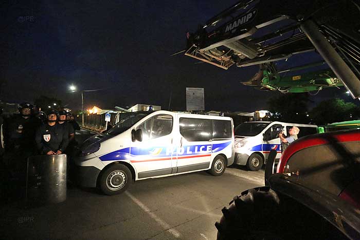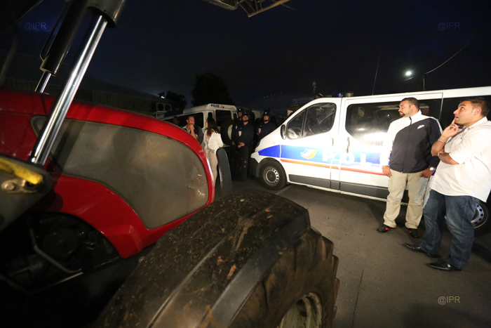 15h30 : la délégation des éleveurs arrive sur le site de la Cilam, les forces de l'ordre les tiennent à l'écart. Certains éleveurs ont emmené avec eux des citernes à lisier.