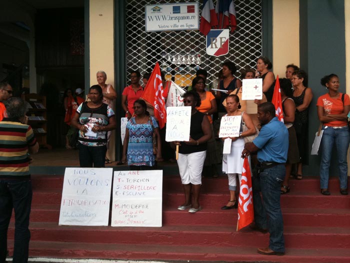 Une vingtaine d'Asem (agents spécialisés des écoles maternelles) manifestent devant la mairie de Bras-Panon depuis 9h ce matin, mardi 3 mai 2011, pour demander leur titularisation. Un préavis de grève de 24 heures avait été déposé le 27 avril dernier. Les agents dénoncent "le silence" du maire, Daniel Gonthier.
