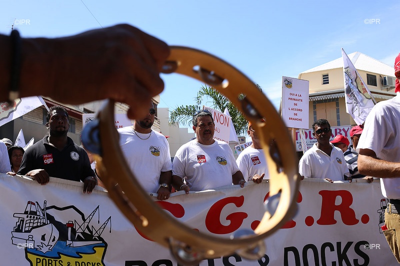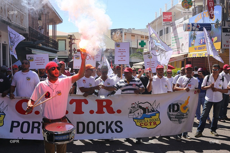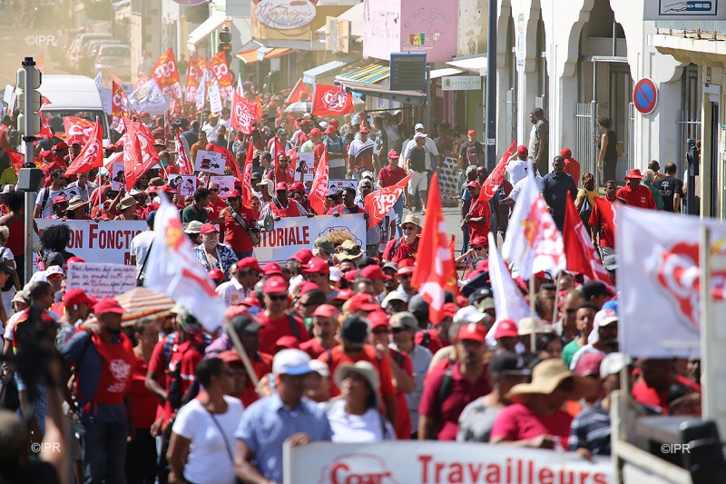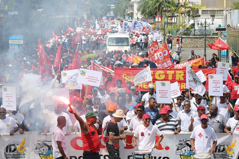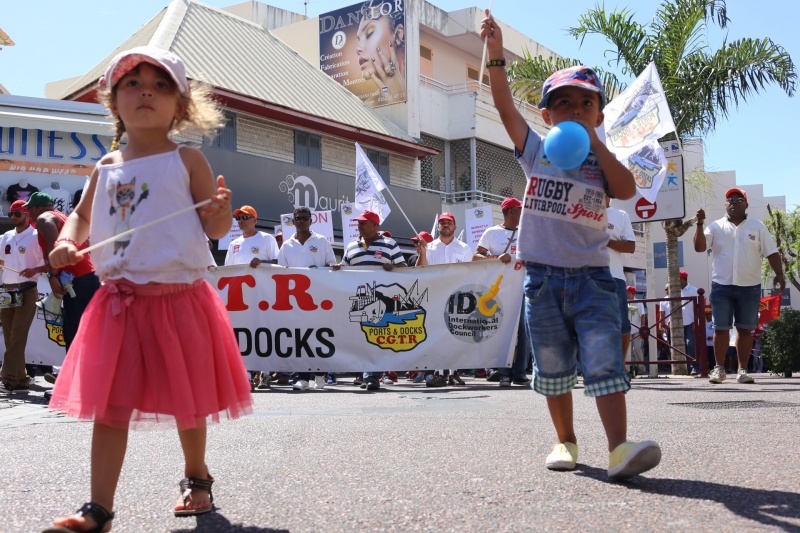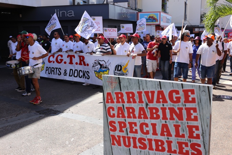 “L’assassin, l’assassin, l’assassin mi sa met de feu dans ce gouvernement mes amis”. Au milieu de la manifestation qui remonte la rue Maréchal Leclerc en direction de la préfecture de Saint-Denis, la CGTR Docks et Port chante son rejet de la politique du gouvernement sur l’air de la célèbre chanson de Jean-Paul Volnay.