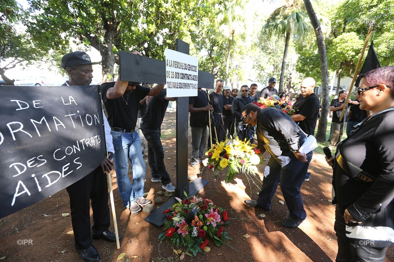 Un dépôt de gerbes symbolique a été effectué ce mercredi 20 juin 2015 à 10 heures devant la préfecture de Saint-Denis par les membres de la plateforme des associations emplois verts de La Réunion. Ils remettent en cause les mesures issues de la réforme du 5 mars 2014 relative à la formation professionnelle.