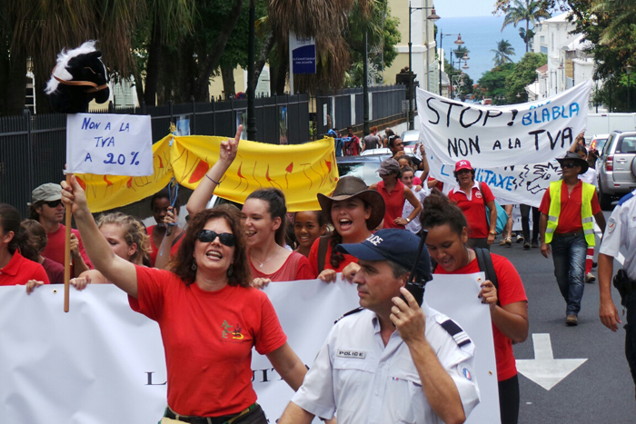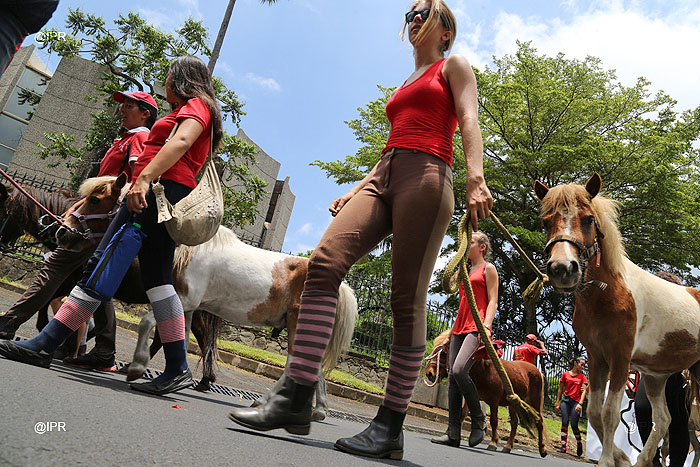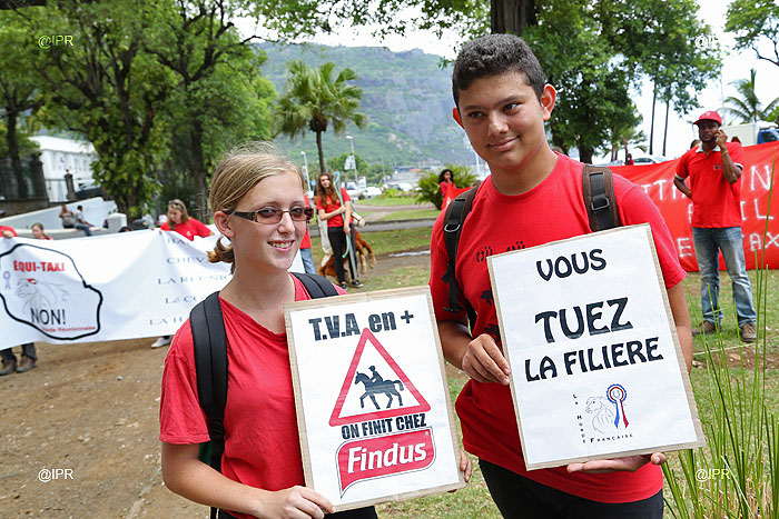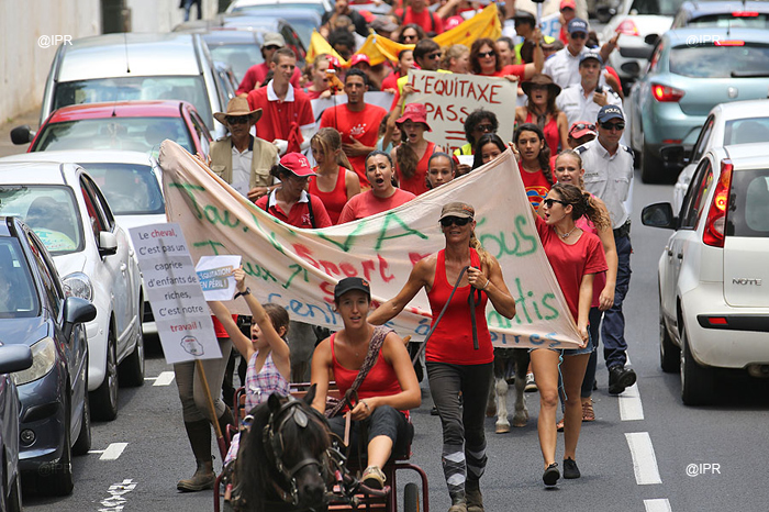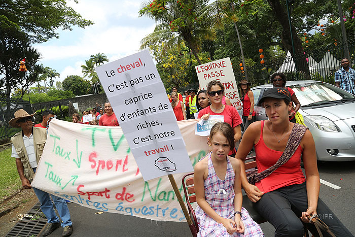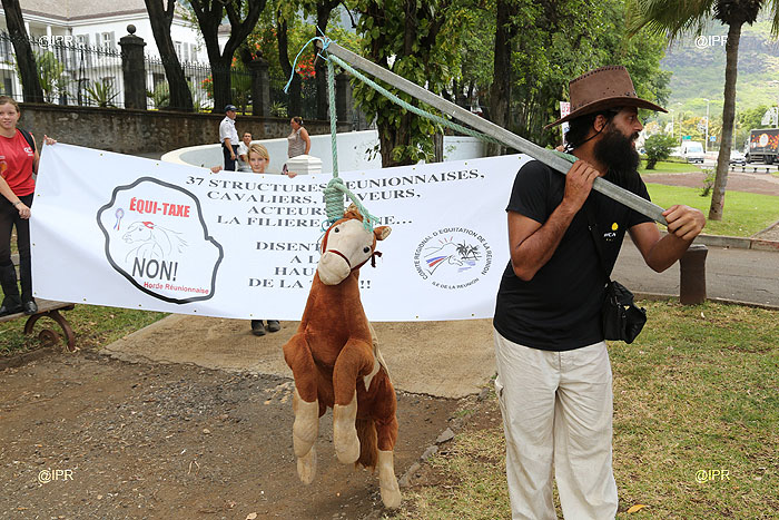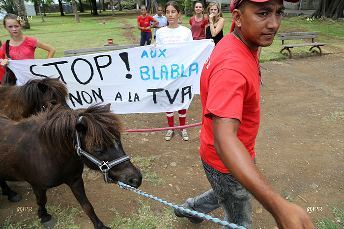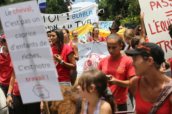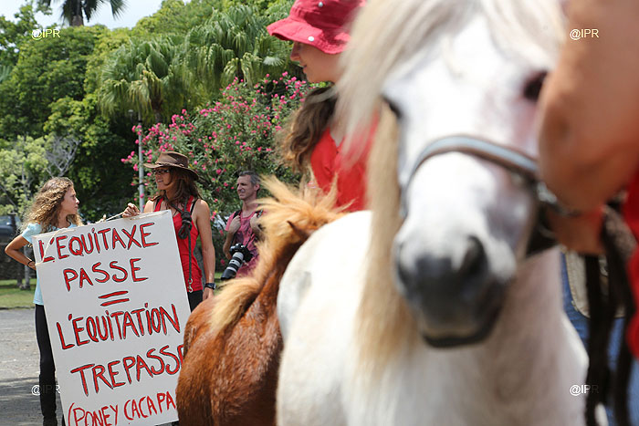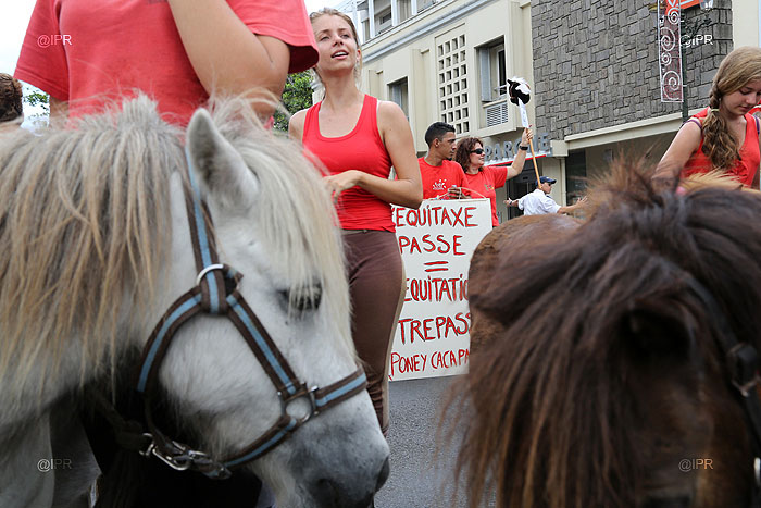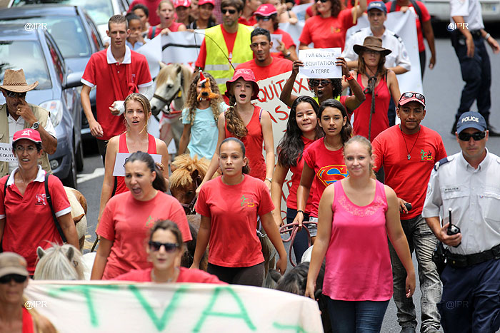 Scène insolite ce jeudi matin 19 décembre 2013 dans les rues de Saint-Denis. Des poneys défilent dans la ville. Regroupés sous la bannière de la "Horde réunionnaise", les responsables des centres équestres de l'île protestent ainsi contre la hausse de la TVA (taxe sur la valeur ajoutée). Dans leur secteur d'activité cette taxe passe de 2,10% à 8,5%. Une hausse qui devrait être répercutée sur les tarifs des prestations proposées aux clients. "Cette equitaxe va mettre gravement en danger tout notre secteur d'activités, puisqu'il n'est pas du tout certains que les clients accepteront de payer plus cher" commentent les professionnels de la filière équestre. Ils n'excluent pas de durcir leur mouvement s'ils ne sont pas entendus. "À La Réunion, c'est très facile de tout bloquer" prévient Helga Muller, coordinatrice de la "Horde réunionnaise".