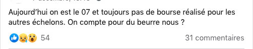 Comme chaque mois, la bourse est attendue avec impatience par les étudiants qui l’utilisent généralement pour régler leur loyer et faire leurs courses. Seulement ce mois-ci, les élèves boursiers ont eu la mauvaise surprise de voir l'attribution de l’aide retardée. La mise en paiement de l’allocation du mois décembre a en effet été lancée à la fin du mois novembre pour les seuls étudiants se situant entre les échelons 4 et 7, laissant de côté les grades de 0 et 3. Cette aide allouée aux étudiants de ce niveau est comprise entre 103 et 329 euros, ce qui n’est pas négligeable pour des étudiants n'ayant pas forcément la possibilité de pouvoir compter sur leurs parents ou sur un petit boulot.