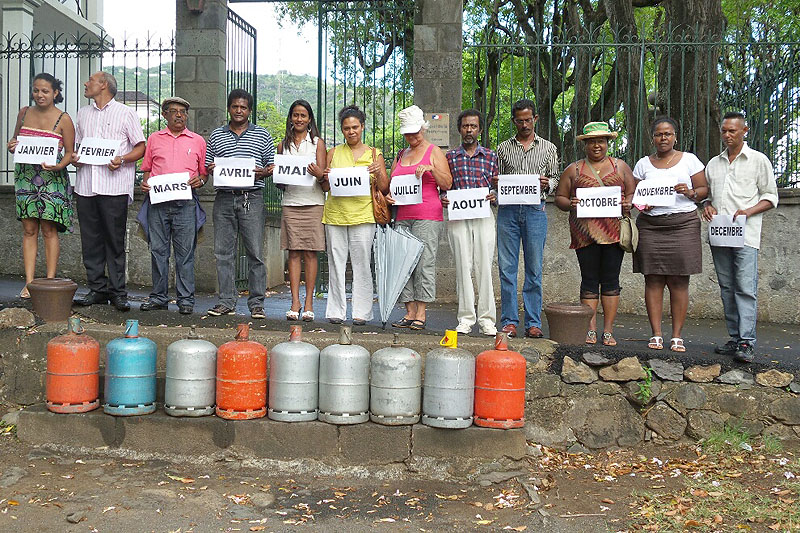 En milieu de matinée ce mardi 28 janvier 2014, une quinzaine de membres de Rezistans et de l'ARCP (alliance des Réunionnais contre la pauvreté) s'est rassemblée devant les grilles de la préfecture à Saint-Denis. Douze bonbonnes de gaz, représentants chaque mois de l'année, ont été disposées devant l'entrée. Par cette opération, il s'agissait, pour les membres de Rezistans/ARCP de mettre "les politiques face à leurs responsabilités" et de proposer une bonbonne à 15 euros, ainsi que son intégration dans le bouclier-qualité-prix. (photo Mélissa Perciot)