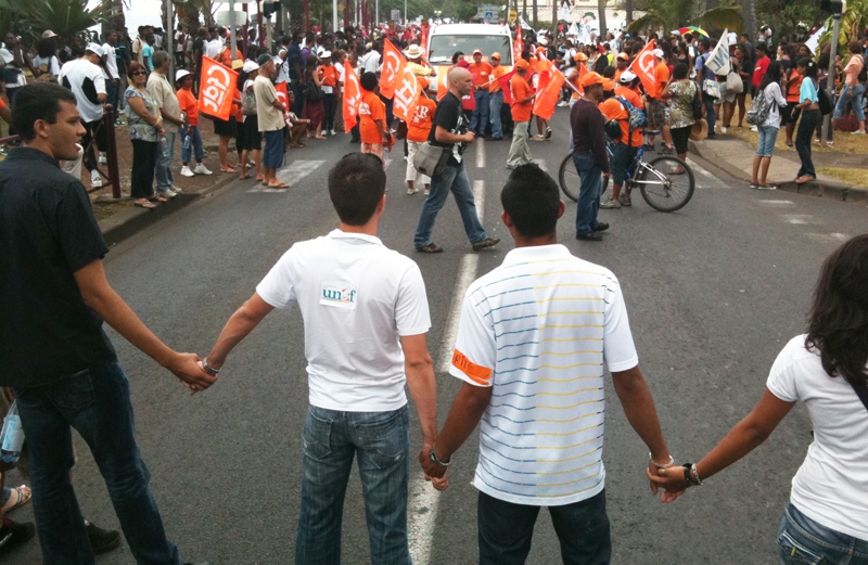 Depuis 11 heures 30 ce jeudi 28 octobre 2010 une partie des manifestants bloque la circulation sur le Barachois à Saint-Denis. Tout se passe dans le calme. Ils ont plusieurs milliers à s'être mobilisés, à l'appel de l'intersyndicale, à Saint-Denis et de Saint-Pierre pour manifester contre la réforme des retraites. Les cortèges sont rajeunis par rapport aux manifestations précédentes. En effet, lycéens et étudiants se sont mobilisés en nombre pour cette journée d'action. C'est le principal motif de satisfaction des syndicalistes qui tiennent tous le même discours : "la jeunesse se mobilise. Elle a conscience que cette réforme des retraites est mauvaise".