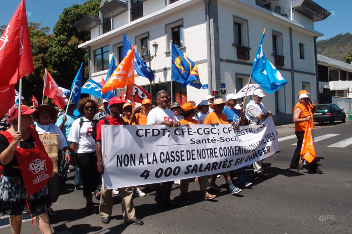 À l'appel de l'intersyndicale (CFDT, CFTC, CFE-CGC, CGTR, FO) du secteur sanitaire, social et médico-social, plus d'une centaine de personnes manifeste depuis ce lundi 15 octobre 2012 au matin. Ils protestent contre la remise en cause de la convention collective de 1951 par la FEHAP (fédération des établissements hospitaliers et d'aide à la personne), syndicat de la majorité des employeurs du secteur sanitaire et social. Rassemblés vers 10 heures au Jardin de l'État à Saint-Denis, les manifestants se sont ensuite dirigés vers la préfecture.