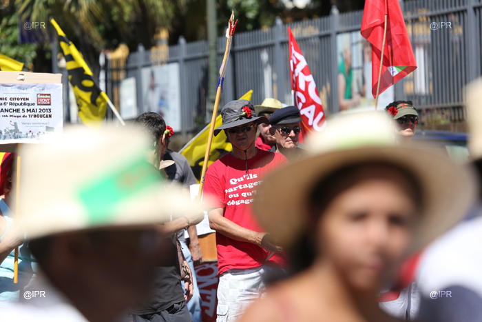 Environ un millier de personnes manifestent à Saint-Denis ce mercredi 1er mai 2013. Malgré l'absence de la CFDT et de la CFTC, la CGTR, l'UNEF, la FSU et le SAIPER estiment qu'ils ont réussi à mobiliser. Les salaires, la lutte contre le pouvoir d'achat mais surtout le refus de l'accord national interprofessionnel (ANI) étaient au coeur des revendications. "Nou tienbo, nou larg' pa" a été l'un des principaux slogans scandés dans le défilé. Parmi les personnalités présentes: la députée-maire de Saint-Paul Huguette Bello, son premier adjoint Jean-Marc Gamarus, le maire du Port Jean-Yves Langenier, son 5ème adjoint et futur candidat à la mairie du Port, Henry Hippolyte, le maire de Sainte-Suzanne, Maurice Gironcel, ou encore Jean-Hugues Ratenon, président de l'Alliance des Réunionnais contre la pauvreté (ARCP).
