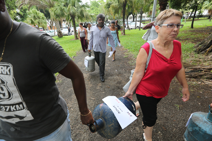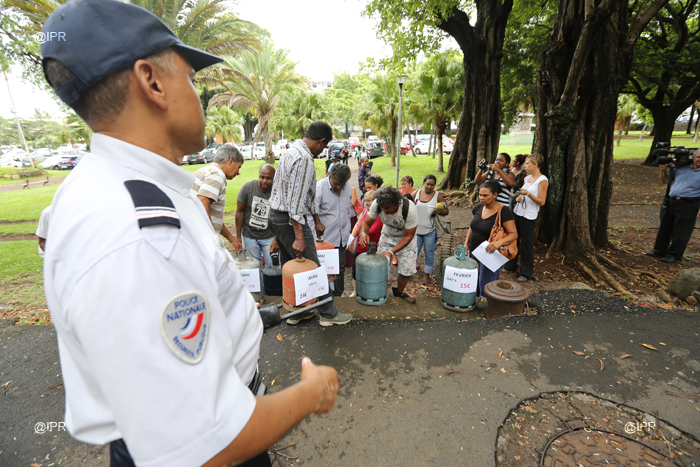 Nouvelle action de l'alliance des Réunionnais contre la pauvreté (ARCP) de Jean-Hugues Ratenon ce vendredi 23 février 2013. En début d'après-midi, une quinzaine de membres de l'ARCP s'est rassemblée devant les grilles de la préfecture à Saint-Denis. 12 bonbonnes de gaz, représentant chaque mois de l'année, ont été disposées devant l'entrée. Par cette action, il s'agit pour l'ARCP de protester contre la hausse du prix de la bouteille de gaz au 1er mars, - plus 7 euros-, et d'alerter les pouvoirs publics sur la nécessité de trouver un juste prix. Une motion a été remise en préfecture.