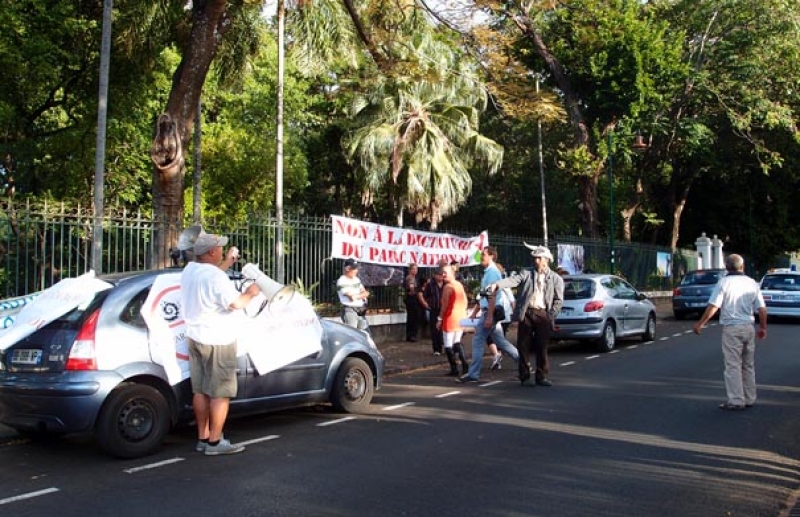 Alors que le Parc national présente, ce jeudi 21 juin 2012 après-midi, son projet de charte au siège du conseil général, près d'une quarantaine de personnes s'est réunie devant les grilles du palais de la Source à Saint-Denis afin de dire "non" à ce projet. À l'initiative de ce mouvement, le collectif pour le maintien des activités dans le coeur du Parc national. Munis de pancartes et banderoles, où sont inscrits "Non à la dictature du Parc national" ou encore "Parc pa nou", les manifestants, essentiellement des commerçants et éleveurs de Sainte-Rose et de Saint-Philippe, estiment que le Parc national ne les concertent pas. À noter qu'une délégation a été reçue en début d'après-midi au conseil général.